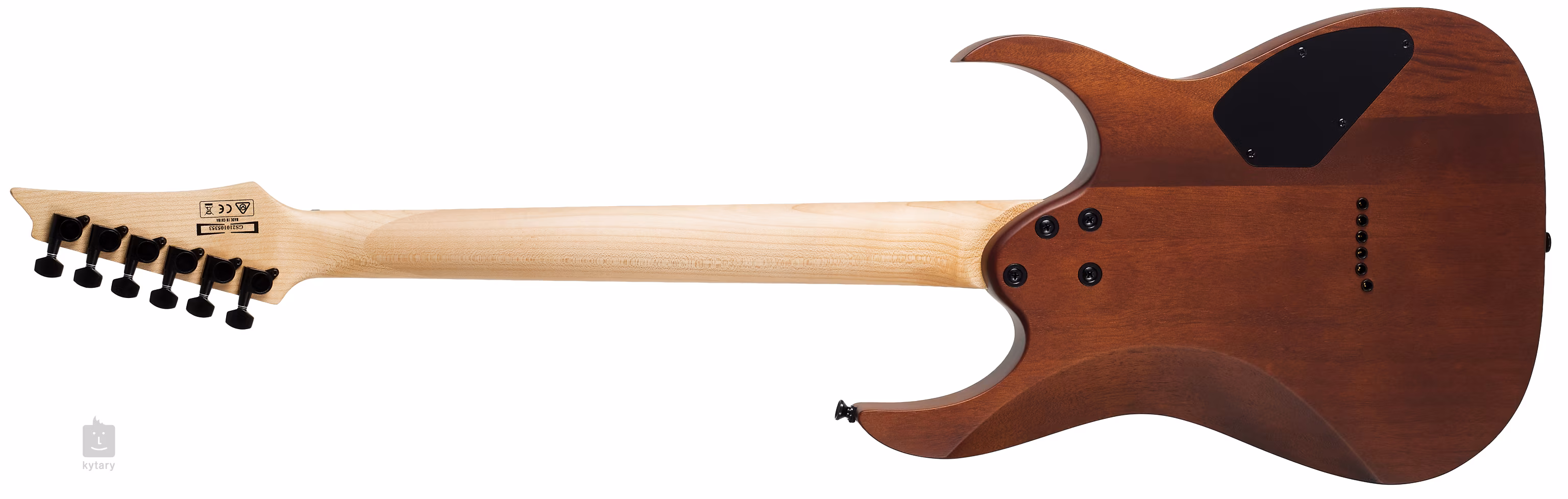 Der Korpus der Gitarre ist aus Okoumé gefertigt. Ein Purpleheart/Amaranth-Griffbrett mit vierundzwanzig Jumbo-Bünden ist auf den Ahornhals geleimt. Die Orientierung auf der Oberfläche wird durch Positionsmarkierungen im Sharktooth-Design erleichtert.