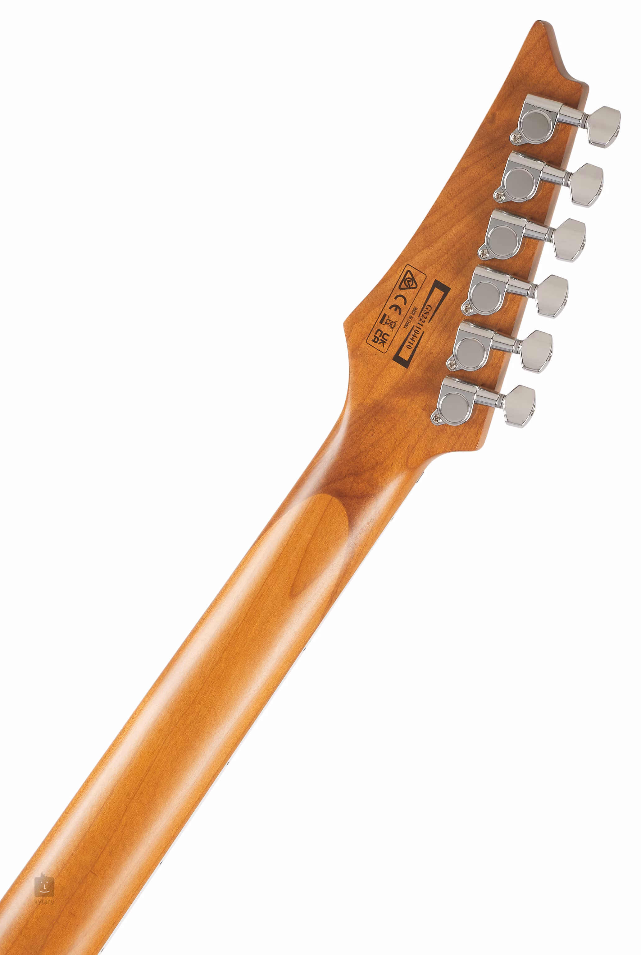 Der Korpus aus Okoumé ist mit einem Transparent Brown Black Burst Finish verziert, das durch ein Pappelwurzelmuster akzentuiert wird (es handelt sich nicht um ein echtes Pappelfurnier). Der Hals aus Roasted Maple ist auf ein Griffbrett aus Purpleheart/Amaranth mit vierundzwanzig Jumbo-Bünden geklebt. Die Orientierung auf seiner Oberfläche wird durch weiße Positionsmarkierungen im Sharktooth-Design erleichtert.