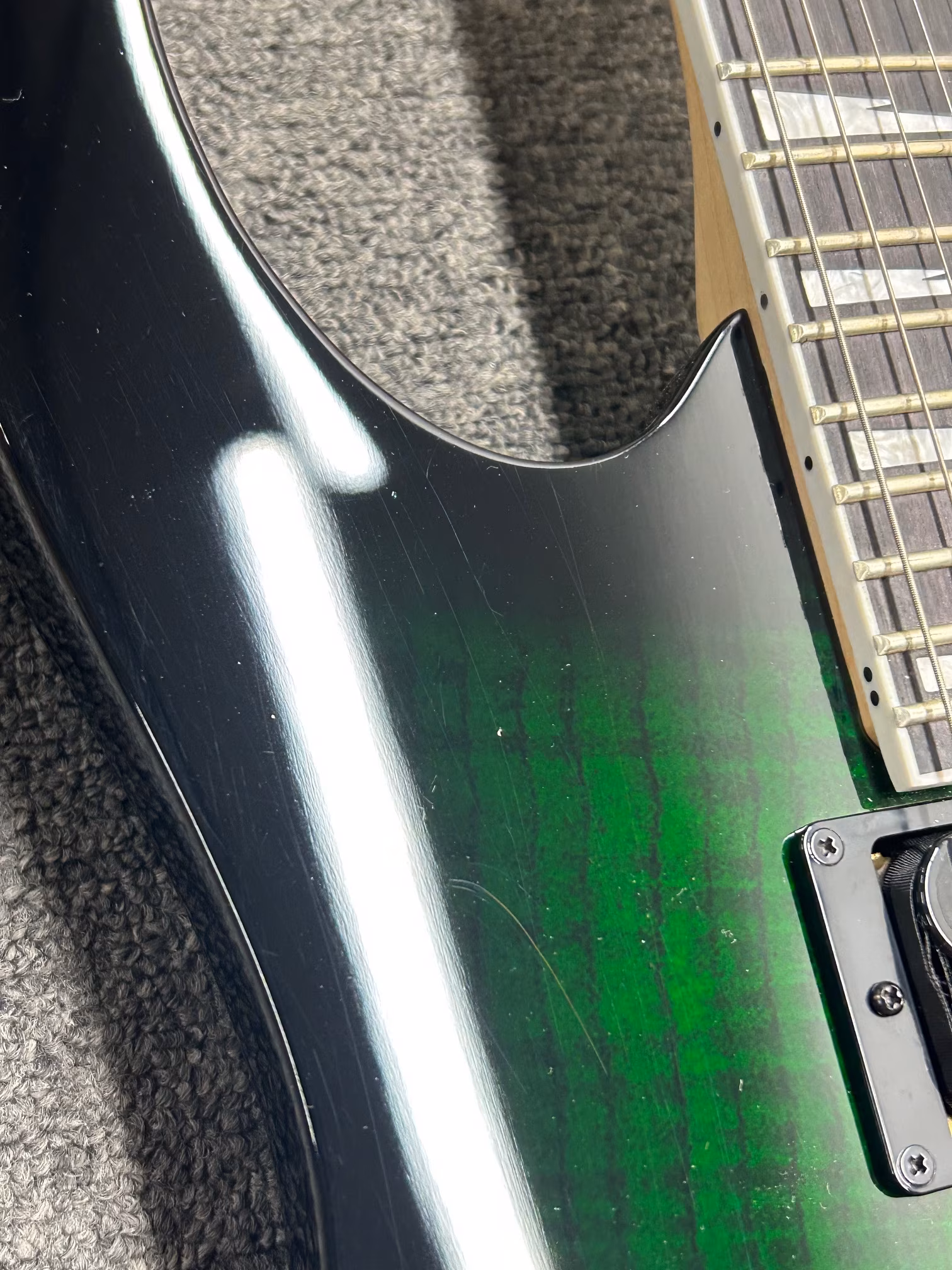 Die E-Gitarre Ibanez GRG320FA-TEB gehört zur GIO-Serie, die preisgünstige Instrumente für Anfänger anbietet. Es handelt sich um ein Super-ST-Modell RG mit einem flacheren Hals, geringerem Gewicht und markanten Ausschnitten im Korpus, das speziell auf angehende Rock- und Metal-Gitarristen zugeschnitten ist. Der Espenholz-Korpus der Gitarre ist mit einer Lindenholzfurnierdekoration in geflammtem Ahorn (Flamed Maple Art Grain Basswood Top) und einer Transparent Emerald Burst-Lackierung verziert. Der Ahornhals ist mit einem Griffbrett aus Purpleheart/Amaranth-Holz mit 24 Medium-Bünden versehen. Die Orientierung auf dem Griffbrett erleichtern Positionsmarkierungen im Sharktooth-Design (Haifischzähne). Zwei firmeneigene Infinity R-Humbucker mit Keramikmagneten verleihen der Gitarre den nötigen Sound-Drive. Die Klangfarbe und -intensität lassen sich mit Hilfe von Lautstärkereglern, Tonreglern und einem Fünf-Positionen-Schalter einstellen, der in den Positionen 2 und 4 eine Split-Coil-Konfiguration der Tonabnehmer, d. h. einen Single-Coil-Charakter, bietet. Die Saiten sind in firmeneigenen Stimmmechaniken und einem Doppelhebel-Tremolo verankert, mit dem Sie Ihr Spiel mit beeindruckenden Soundeffekten verfeinern können.