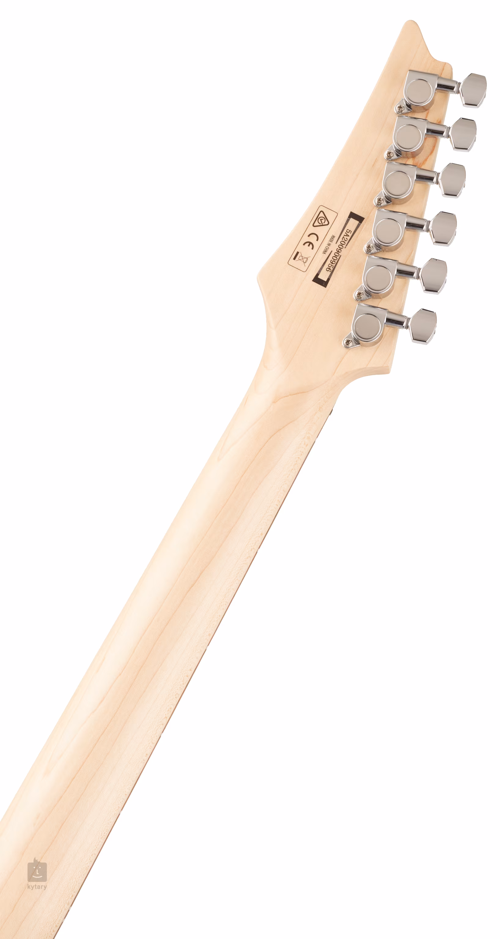 Das Gehäuse des GRGM21-BKN ist derzeit aus Lindenholz gefertigt. Der Ahornhals ist mit einem Jatoba-Griffbrett verleimt, das mit vierundzwanzig mittelgroßen Bünden ausgestattet ist. Die Orientierung auf der Oberfläche wird durch Positionsmarkierungen im Sharktooth-Design erleichtert.