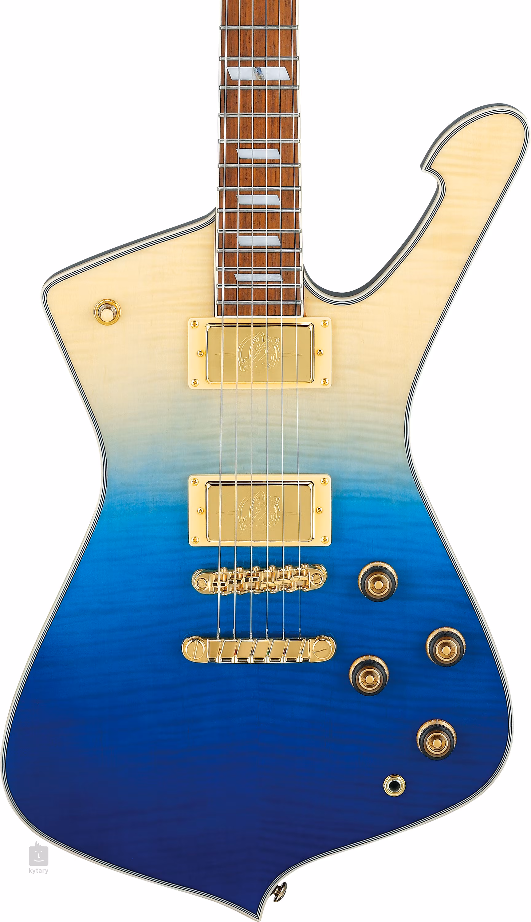 Der Korpus aus Okoumé ist mit einer effektvollen Furnierdekoration aus geflammtem Ahorn und einer Lackierung in Transparent Blue Gradation verziert. Der Hals aus drei Okoumé-Stücken ist mit einem Griffbrett aus Jatoba-Holz mit 22 Medium-Bünden versehen. Die Orientierung auf dem Griffbrett erleichtern Positionsmarkierungen aus Perlmutt (Abalone) und Perlmuttimitat.