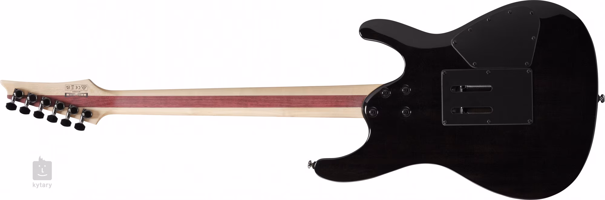 Der Mahagonikorpus des Instruments ist mit einer ausgefallenen Decke aus Flammenahorn verziert. Ein Ebenholzgriffbrett mit vierundzwanzig Jumbo-Bünden ist auf einen verschraubten Hals aus drei Teilen Ahorn und Purpleheart geklebt. Ein Perlmuttmotiv (Beaten Path) mit hervorgehobenen Positionsmarkierungen/Impulsen verläuft über das Griffbrett. Nachleuchtende Markierungen an der Seite des Griffbretts erleichtern die Orientierung auf der Oberfläche des Griffbretts und in beleuchteten Bühnenumgebungen.