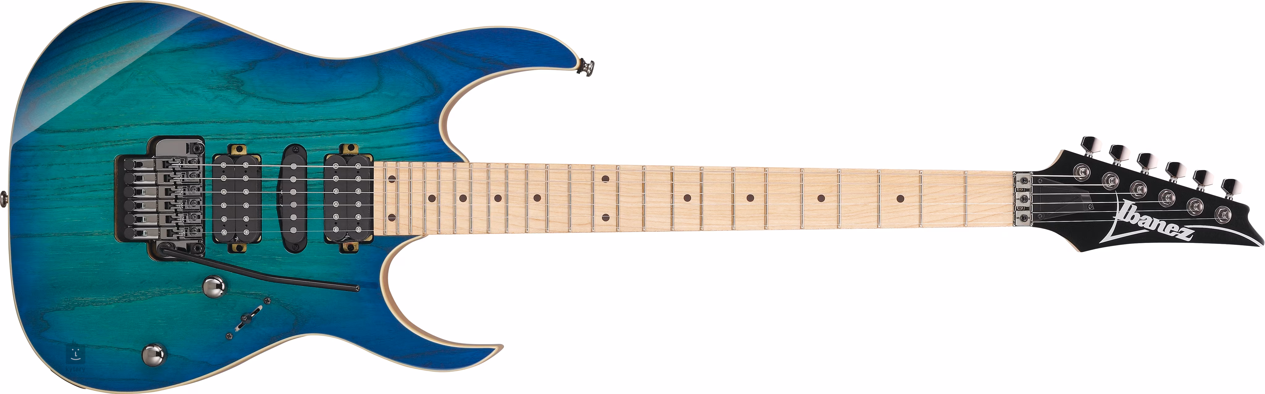Der Eschenkorpus der RG470AHM-BMT ist mit einer Hochglanzlackierung und dem Blue Moon Burst-Farbschema verziert. Der schnelle Hals mit Wizard-III-Profil und das Griffbrett sind aus Ahorn gefertigt. Vierundzwanzig Jumbo-Bünde und schwarze Positionspunkte gliedern die Griffbrettoberfläche.