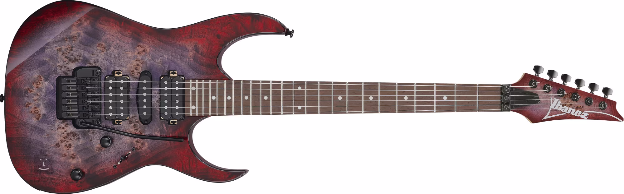 Der Meranti-Korpus der RG470PB-REB ist mit einem Pappel-Maser-Deckenfurnier verziert. Der schnelle Ahornhals mit Wizard-III-Profil ist mit einem Jatoba-Griffbrett mit vierundzwanzig Jumbo-Bünden verleimt. Weiße Positionspunkte auf dem Griffbrett erleichtern die Orientierung.