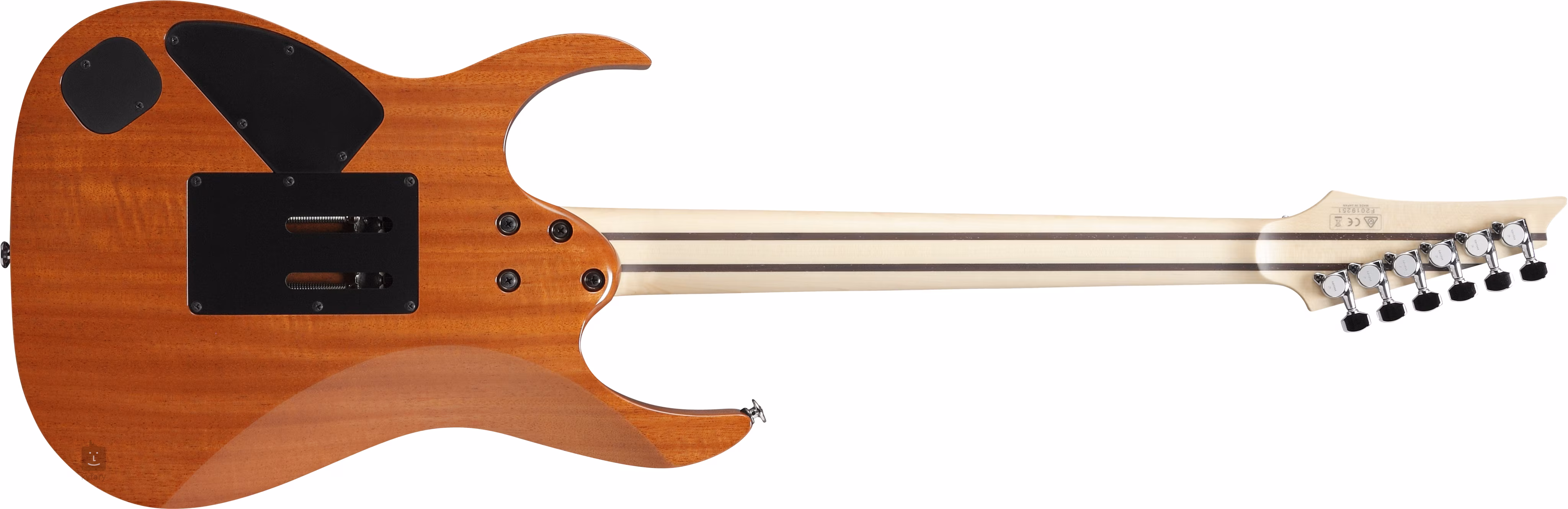 Der Korpus des RG5320C-DFM ist aus afrikanischem Mahagoni gefertigt. Auf den schnellen Hals mit einem Super Wizard HP-Profil aus fünf Teilen Ahorn und Wenge ist ein Makassar-Griffbrett aus Ebenholz geklebt, das mit vierundzwanzig Jumbo-Bünden aus Edelstahl ausgestattet ist. Ihre behandelten Kanten bieten dem Gitarristen einen höheren Spielkomfort (Prestige-Bundkantenbehandlung). Die Orientierung auf der Griffbrettoberfläche wird durch versetzte Perlmutt-Positionspunkte (Mother-of-Pearl) und Leuchtpunkte an der Seite erleichtert.