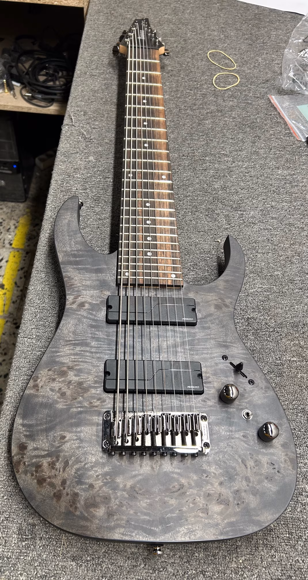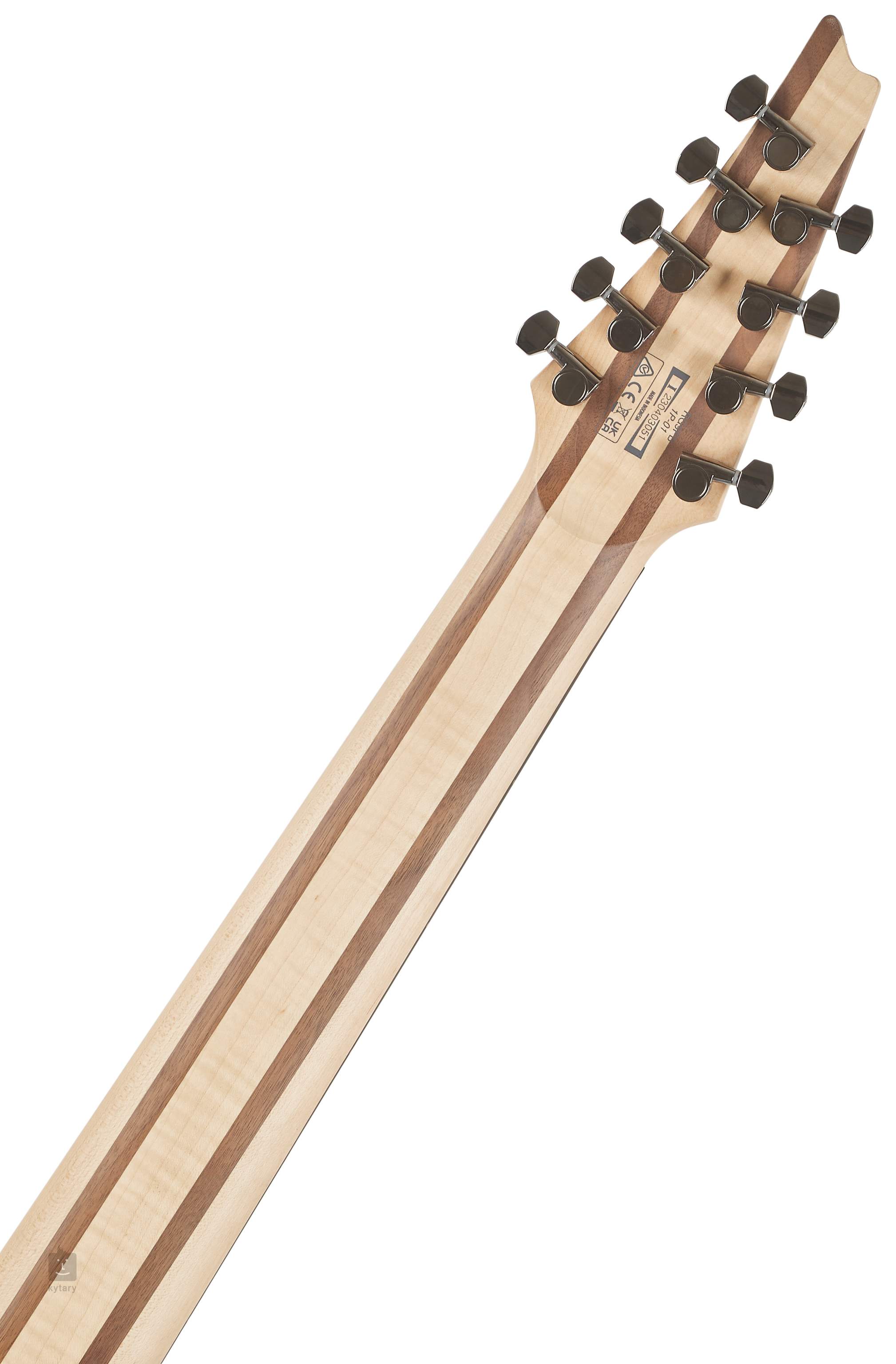 Der Korpus der neunsaitigen RG9PB-TGF-Gitarre ist aus massivem Nyatoh-Holz und Pappel-Maser-Deckenfurnier gefertigt. Ein fünfteiliger Hals aus Ahorn und Walnuss mit einem Wizard-9-Profil ist mit einem Makassar-Ebenholz-Griffbrett verschraubt, das mit vierundzwanzig Jumbo-Bünden ausgestattet ist. Neun Saiten sind auf die längere Mensur (712 mm) des Instruments abgestimmt.