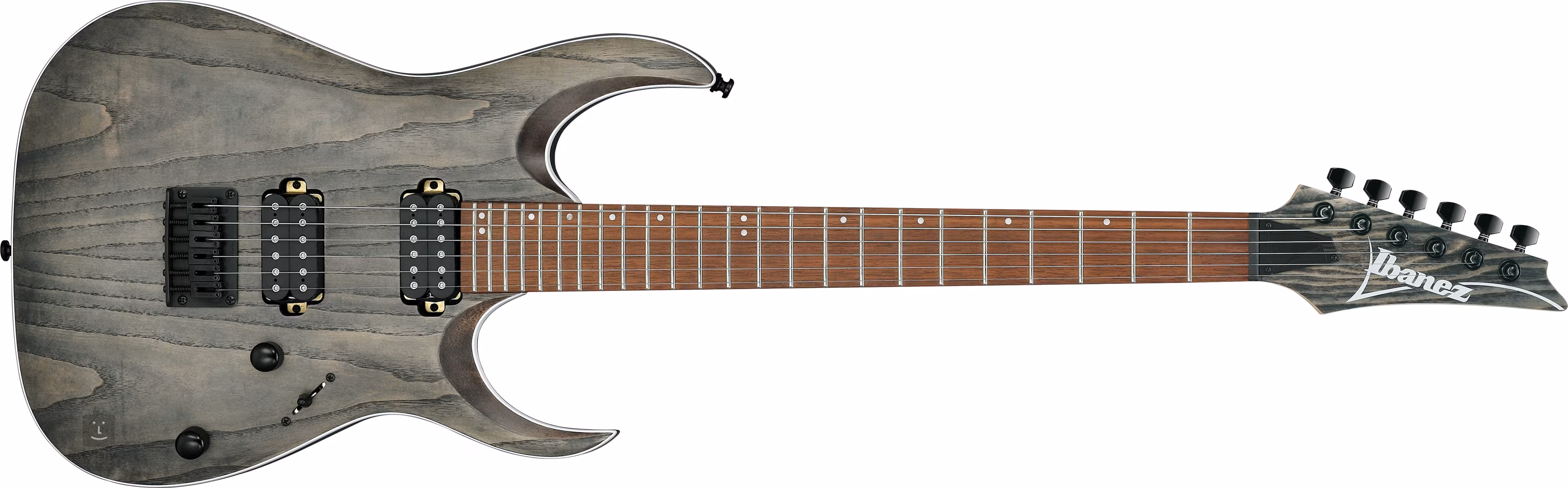 Der Korpus der RGA42AH Black Stained besteht aus Meranti-Holz und hat eine Esche-Decke. Der schnelle Ahornhals mit Wizard III-Profil ist auf ein Jatoba-Griffbrett mit vierundzwanzig Jumbo-Bünden geleimt. Die Orientierung auf dem Griffbrett wird durch versetzte Positionspunkte erleichtert.