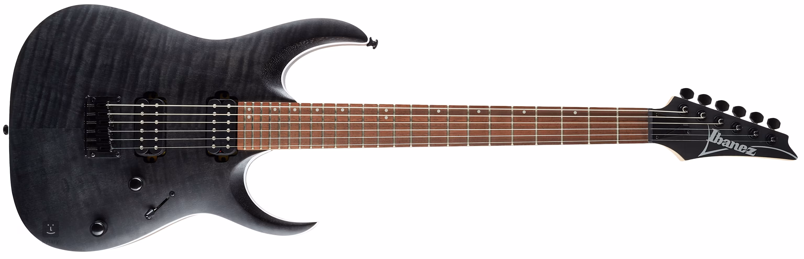 Der Korpus der RGA42FM-TGF ist aus Meranti und einem spektakulären Furnier aus geflammtem Ahorn gefertigt. Auf den schnellen Ahornhals mit Wizard III-Profil ist ein Griffbrett aus Jatoba, einem Holz, das auch als brasilianische Kirsche bekannt ist, geklebt, das mit vierundzwanzig Jumbo-Bünden ausgestattet ist. Weiße Offset-Positionspunkte erleichtern das Navigieren auf dem Griffbrett.