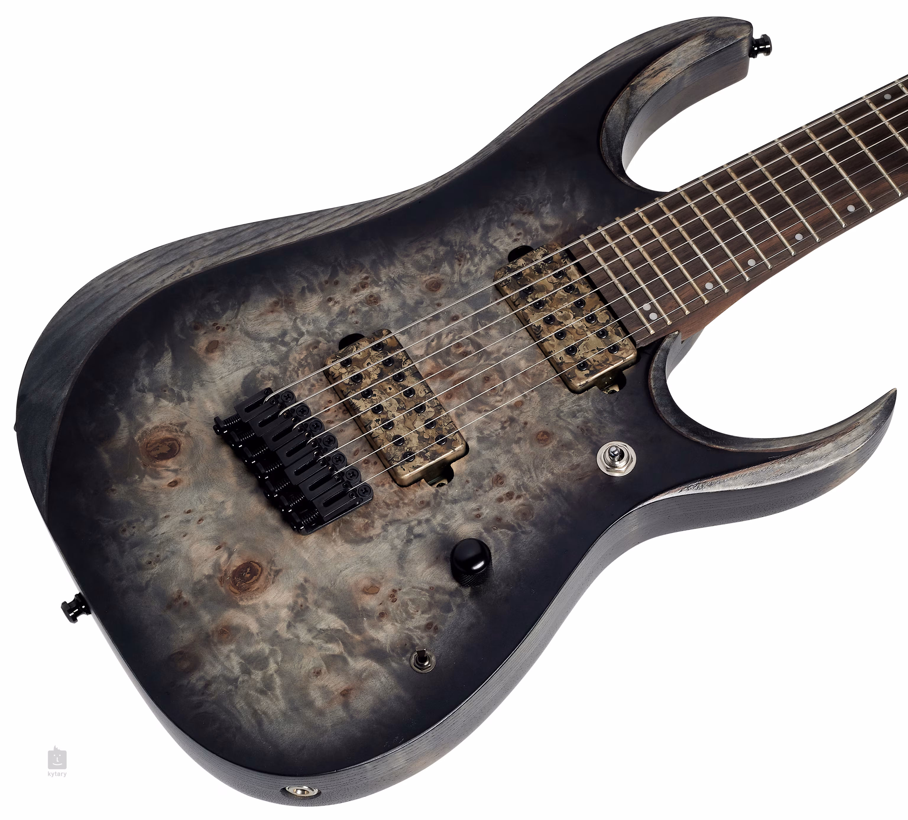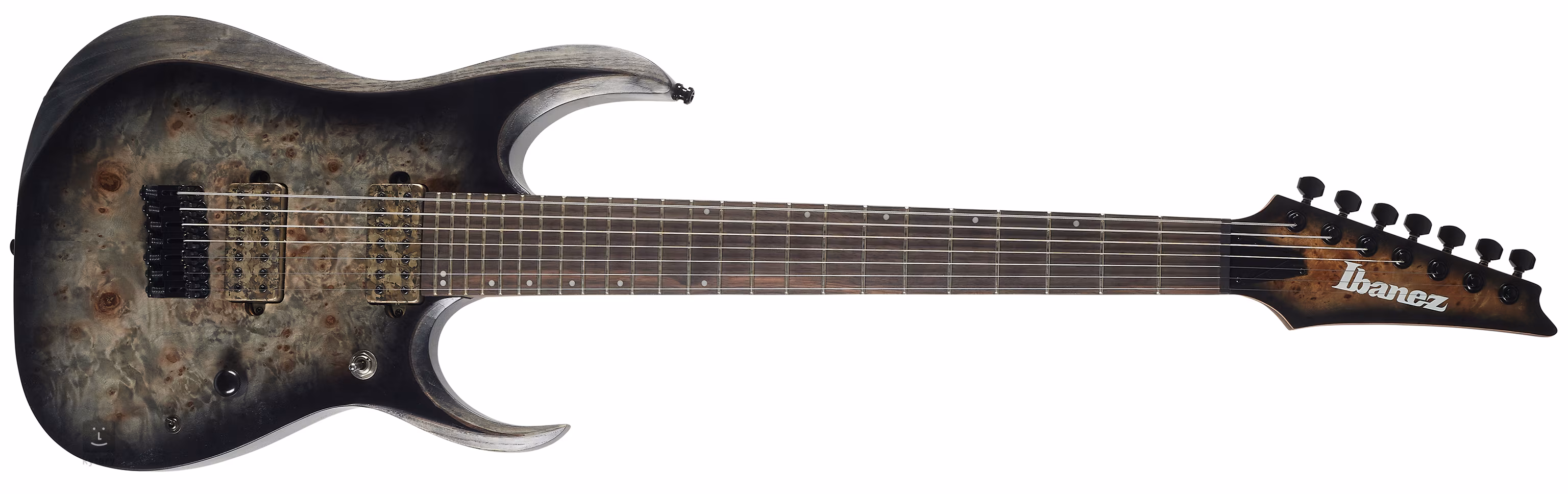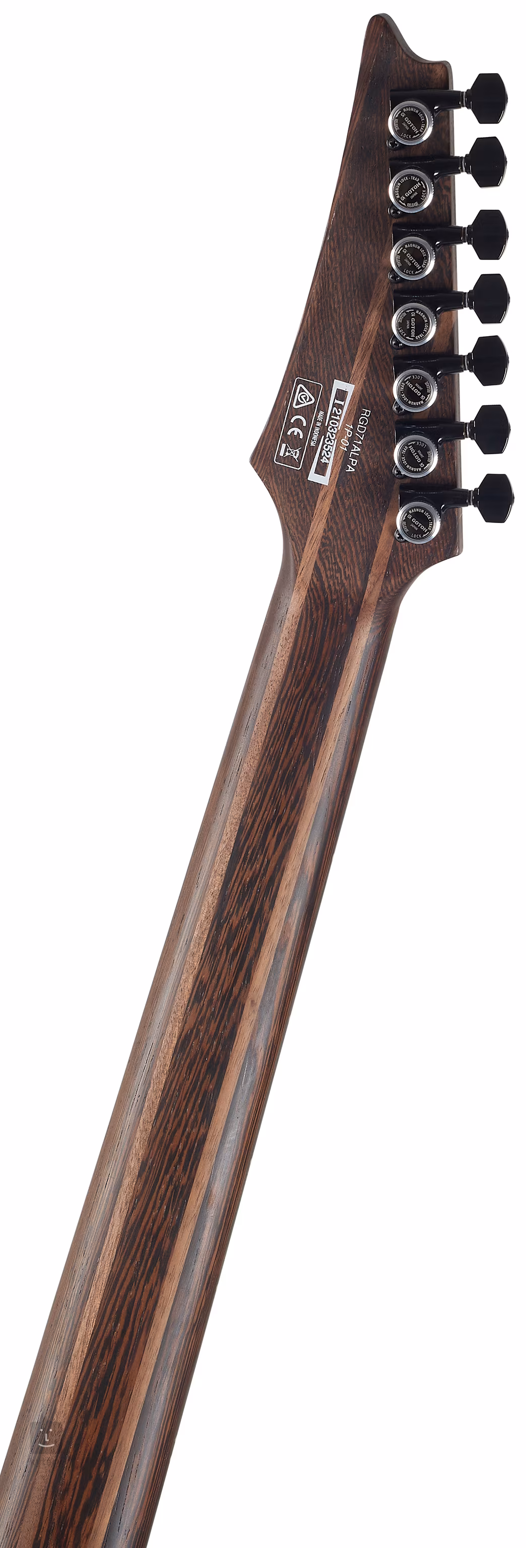 Der Korpus der siebensaitigen Gitarre RGD71ALPA-CKF besteht aus laminierter Esche und Nyatoh und einem spektakulären Deckenfurnier aus Pappelwurzel. Auf den Hals, der aus fünf Stücken Walnuss und Panga Panga besteht, ist ein Makassar-Griffbrett aus Ebenholz geklebt, das mit vierundzwanzig kryogenisch behandelten Jumbo-Bünden ausgestattet ist. Die Orientierung auf der Oberfläche wird durch weiße Offset-Positionspunkte und nachleuchtende Markierungen an der Seite erleichtert, so dass Sie auch in dunklen, beleuchteten Bühnenumgebungen einen perfekten Überblick über die Bewegungen auf dem Griffbrett haben. Dank der längeren Mensur (673 mm) kann die Gitarre auch ausgeprägtere Stimmungen vertragen.