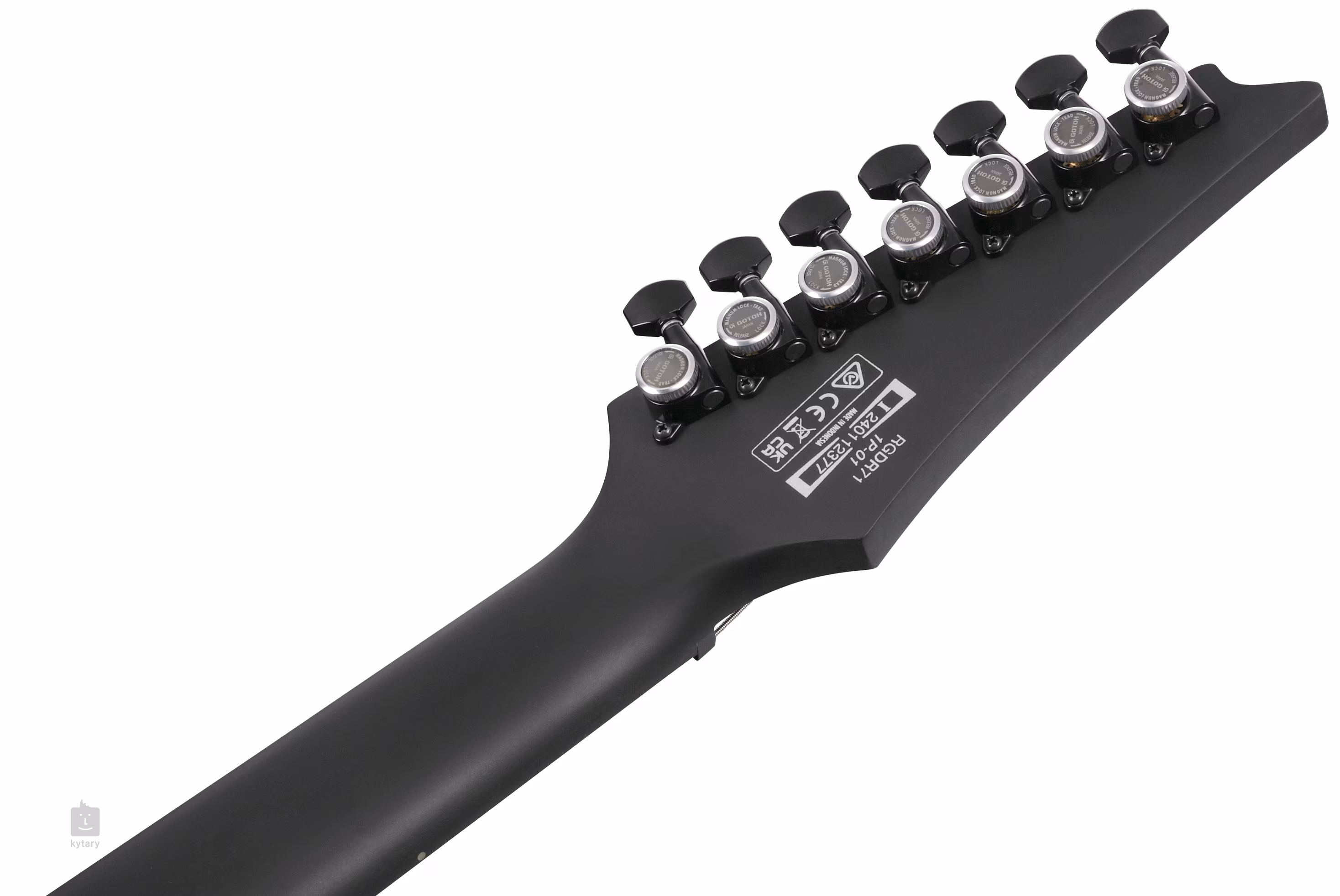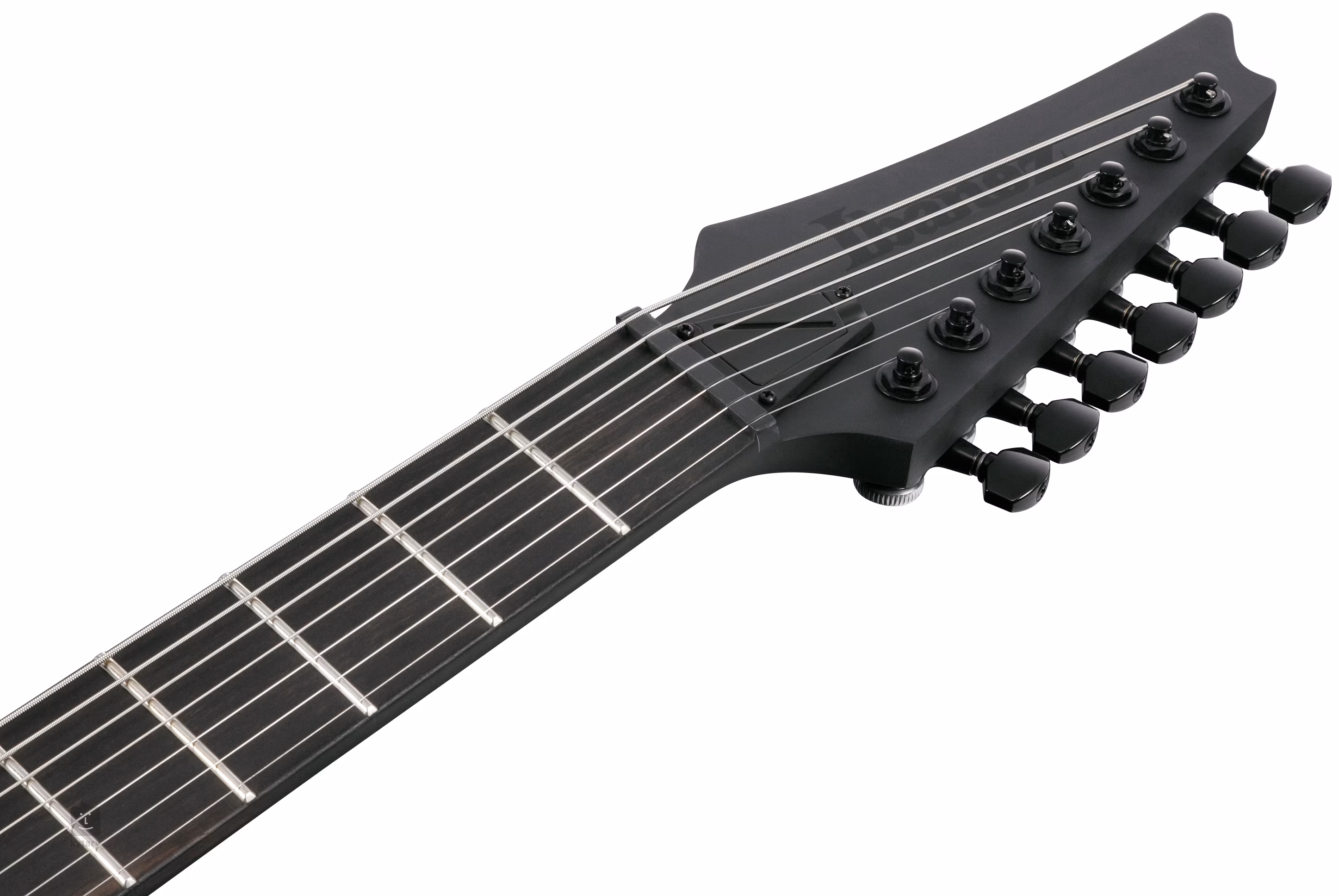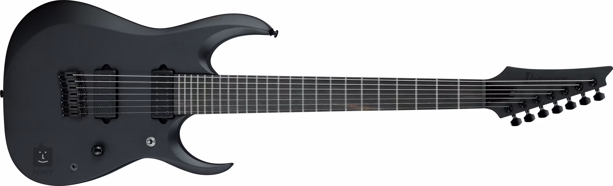 Der Korpus der siebensaitigen Gitarre RGDRB71-BKF Iron Label ist aus Nyatoh-Holz gefertigt. Ein Ebenholz-Griffbrett mit vierundzwanzig Jumbo-Bünden ist auf einen verschraubten Hals aus "gebackenem" Ahorn mit einem schnellen Wizard II-7-Profil geklebt. Leuchtpunkte an den Seiten helfen Ihnen, sich auch in der Dämmerung auf dem Griffbrett zurechtzufinden.