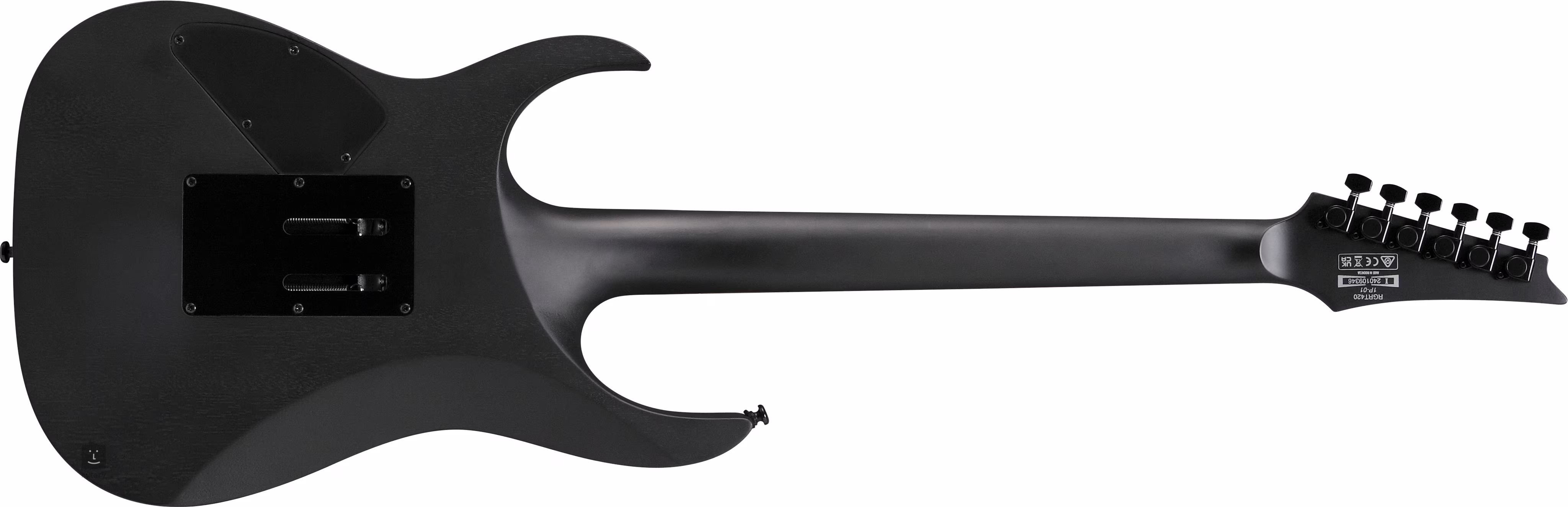 Die Konstruktion der RGRT420-WK besteht aus einem Korpus aus Nyatoh-Holz und einem Fast-Through-Hals aus fünf Teilen Ahorn und Walnuss. Vierundzwanzig Jumbo-Bünde gliedern das Jatoba-Griffbrett. Weiße Positionspunkte auf dem Griffbrett erleichtern die Orientierung.