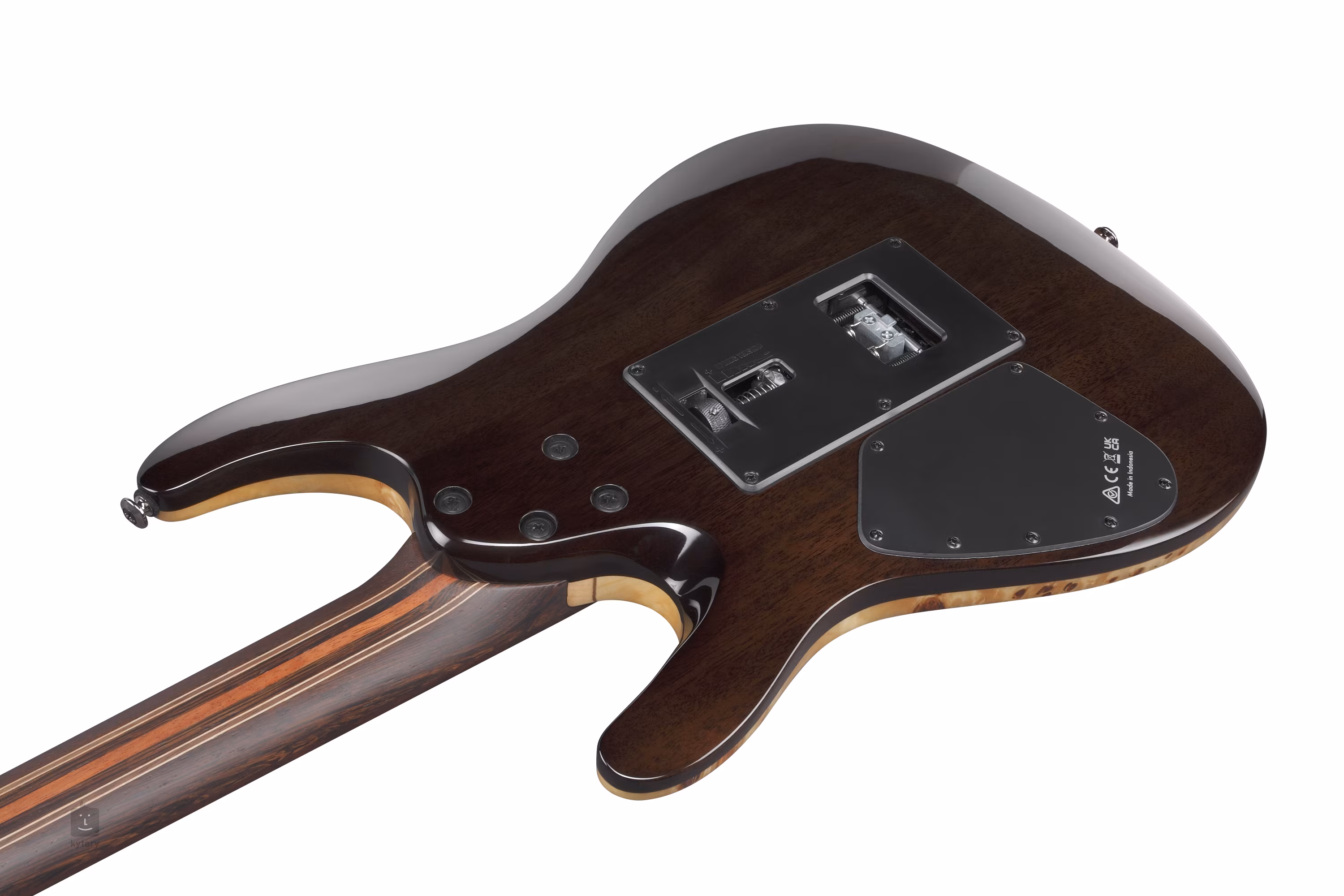 Der Mahagoni-Korpus der S1070PBZ-CKB verfügt über eine spektakuläre Pappel-Maserdecke und Streifen aus Ahorn, Walnuss und Panga Panga. Der Hals, der aus elf Stücken Panga Panga, Ahorn, Walnuss und Bubinga besteht, bietet ein ähnliches Mosaik an Materialien. Das Palisander-Griffbrett ist durch vierundzwanzig Jumbo-Bünde aus rostfreiem Stahl und Positionspunkte aus Perlmutt unterteilt. Die abgerundeten Bundkanten (Premium-Bundkantenbehandlung) und die Leuchtpunkte an der Seite bieten mehr Spielkomfort.