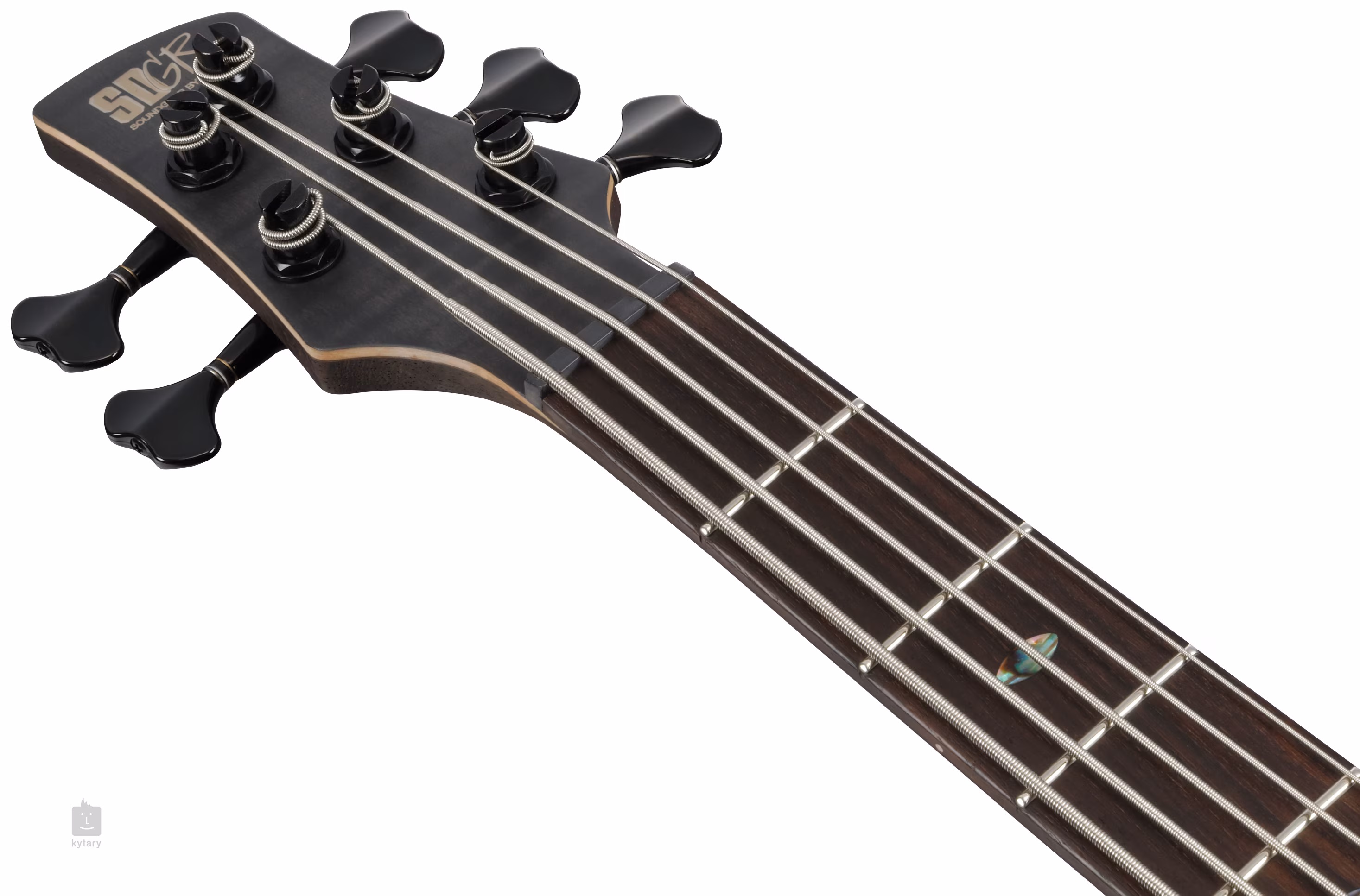 Der Mahagoni-Korpus des fünfsaitigen SR1455DW Transparent Gray aus der Premium-Serie ist mit einer geflammten Ahorn- und Esche-Decke verziert. Ein fünfteiliger Hals aus Panga Panga und Purpleheart ist mit einem Palisandergriffbrett mit vierundzwanzig Medium-Bünden verleimt. Die Enden der Bünde sind abgerundet, um ein schnelleres Spielen zu ermöglichen und den Griff am Hals zu erleichtern (Premium Fret Edge Treatment). Der Hals ist mit einer speziellen Titanverstärkung (KTS-Titanstäbe) verstärkt, und die Orientierung auf dem Griffbrett wird durch ovale Perlmutt-Positionsmarker (Abalone) erleichtert.
