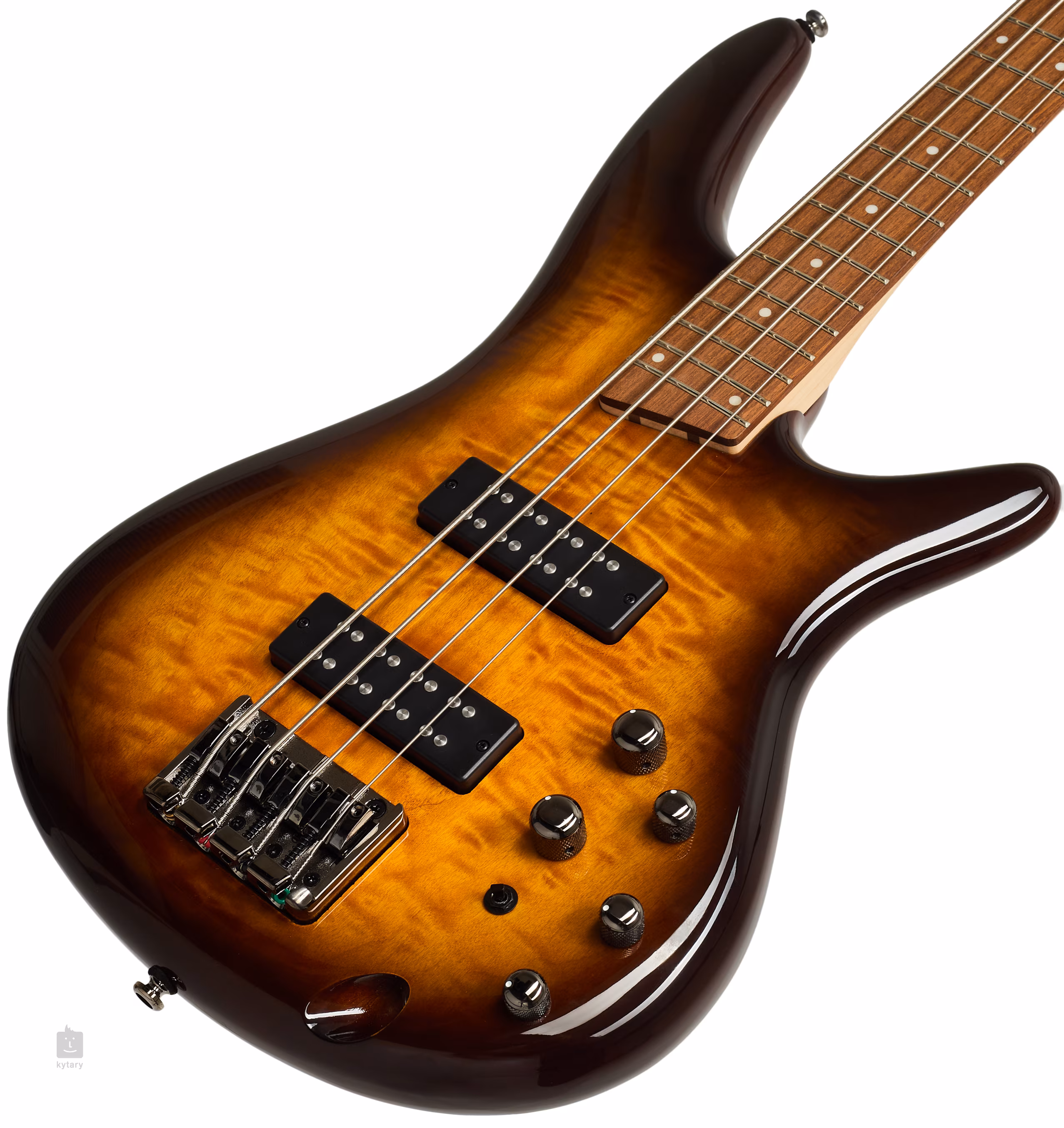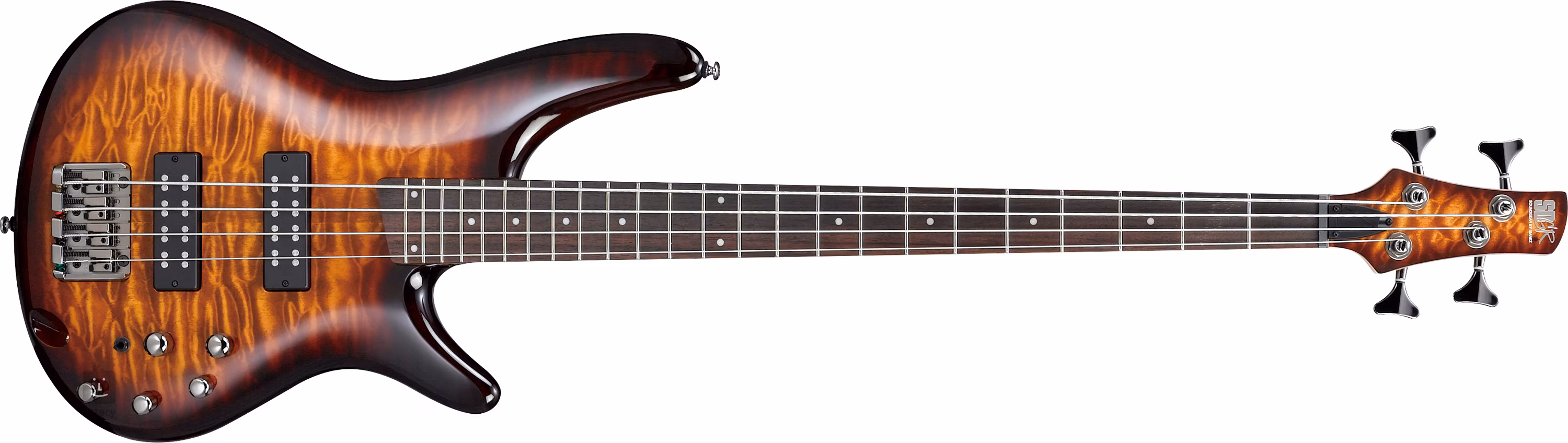 Das gilt auch für den viersaitigen Bass SR400EQM Dragon Eye Burst mit einem Nyatoh-Korpus, einem spektakulären gesteppten Ahorn-Deckenfurnier, einem schnellen fünfteiligen Hals aus Ahorn und Walnuss und einem Jatoba-Griffbrett mit 24 Medium-Bünden.