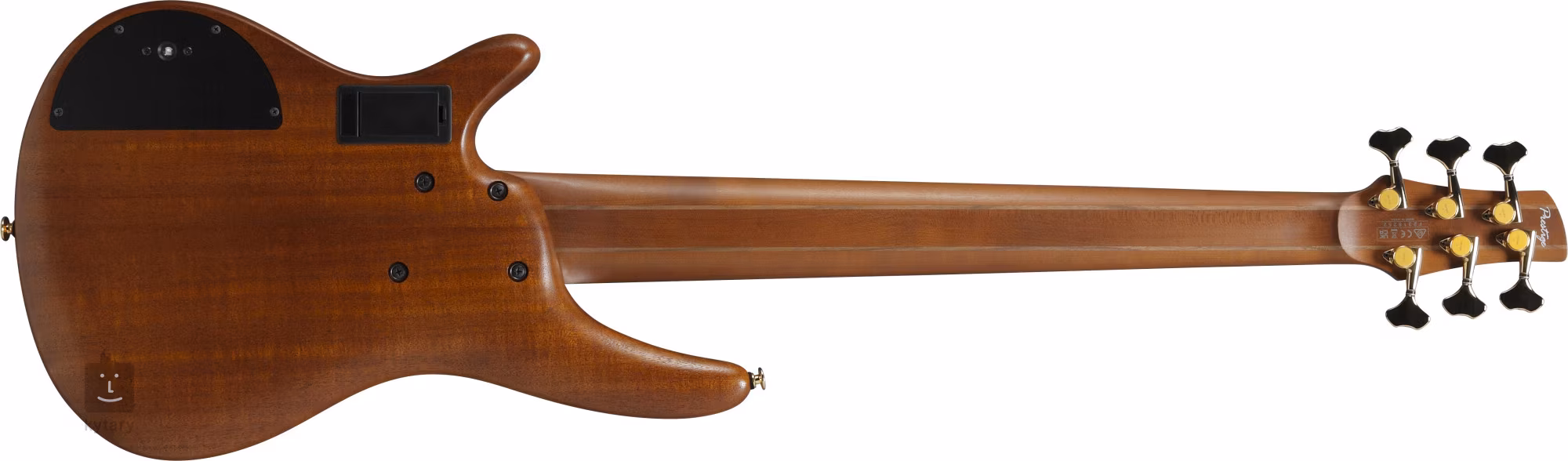Der Mahagonikorpus des sechssaitigen Ibanez SR5506 Mocha E-Basses aus der höherwertigen Prestige-Serie der Japaner ist mit einer Ovangkol-Decke mit markantem Muster versehen. Ein Palisander-Griffbrett aus fünf Stücken geröstetem Ahorn und Walnuss ist auf den schnellen Hals geleimt, der mit vierundzwanzig mittelgroßen Bünden mit Prestige-Bundkantenbehandlung ausgestattet ist. Der Hals des Basses wurde vor dem Zusammenbau dem patentierten S-Tech-Verfahren zur Wärmebehandlung unterzogen, das seine Eigenschaften (Stabilität, Haltbarkeit, Beständigkeit gegen Wasser und Temperaturschwankungen) verbessert und dem Instrument gleichzeitig einen angenehmen Vintage-Touch verleiht. Die Orientierung auf dem Griffbrett wird durch dekorative ovale Perlmuttmarkierungen (Abalone, Perlmutt) erleichtert.