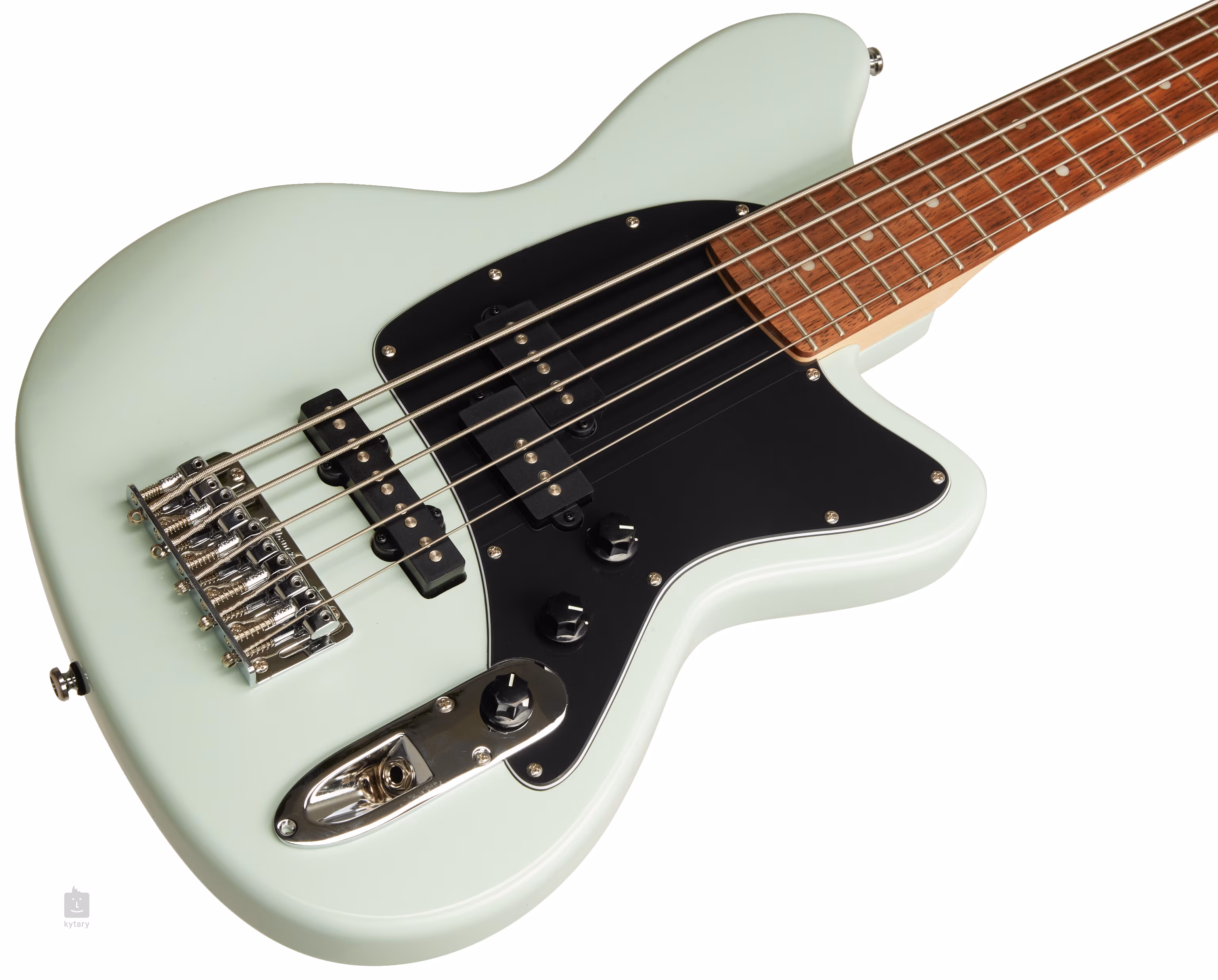 Die Tonabnehmer sind zwei große Dynamix-Tonabnehmer mit Einzelspule, die passiv geschaltet sind. Zwei Lautstärkeregler für jeden Tonabnehmer und eine Klangblende dienen der Tonformung. Die Saiten sind in einem massiven Korpus mit 18 mm Saitenabstand montiert. Große Wirbel sorgen für präzises Stimmen, und die Hardware ist verchromt.