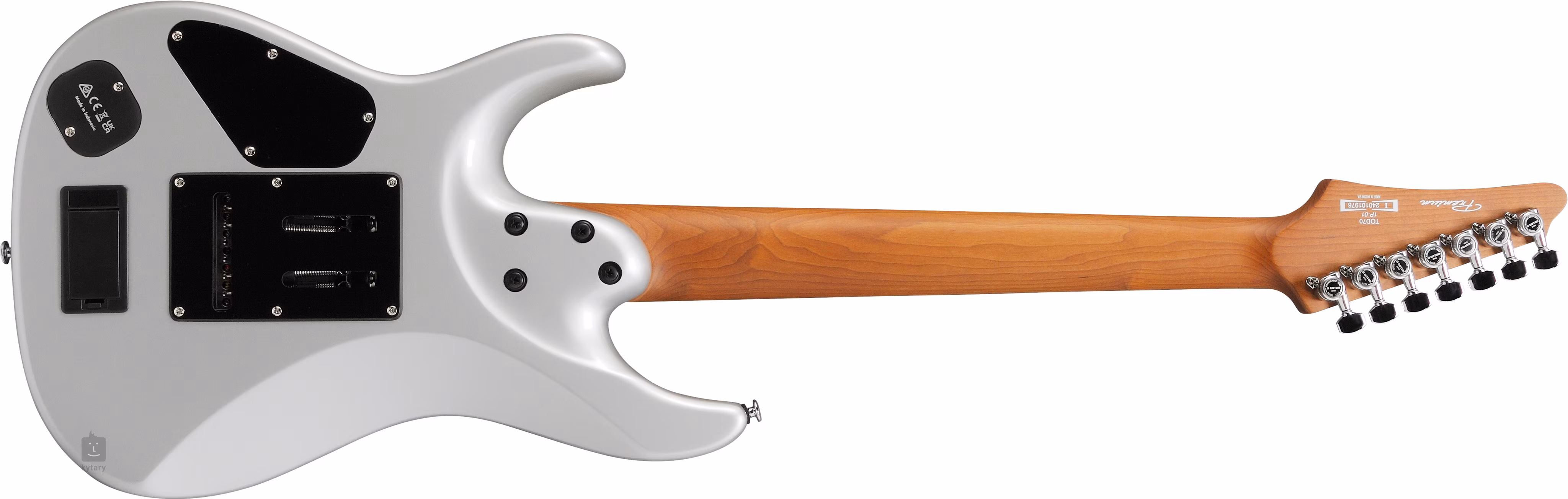 Die Saiten werden in Gotoh MG-T Locking-Mechaniken und Gotoh T1572S Tremolo mit Stahlsätteln und Zinkdruckguss-Tremoloblock gehalten. Der stilvolle Look der Gitarre wird durch eine glänzende Silberlackierung und verchromte Hardware unterstrichen.