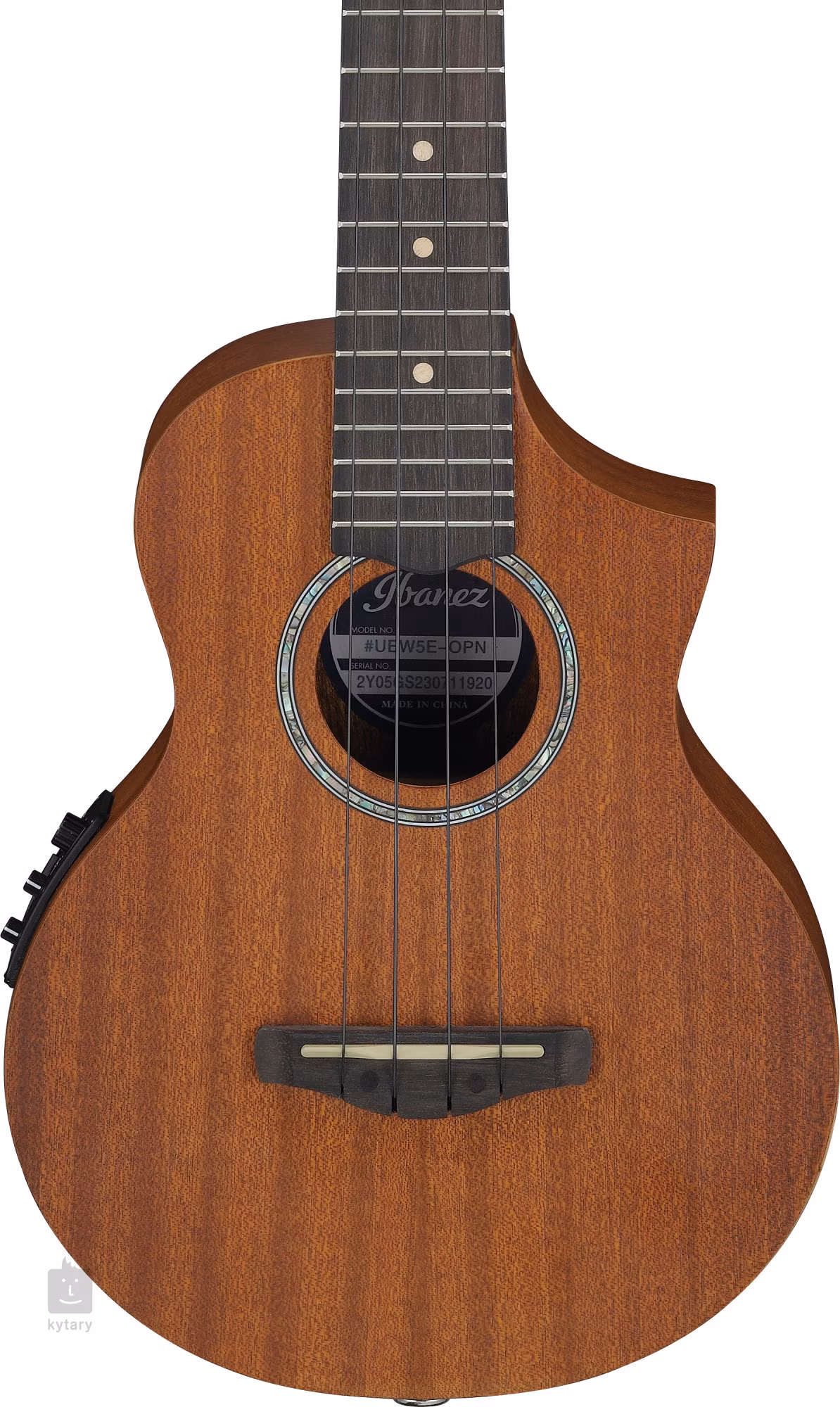 Der Korpus der elektroakustischen Ukulele in Konzertgröße UEW5E-OPN von Ibanez besteht aus laminiertem Sapele. Ein Griffbrett aus Purpurherz/Amarantholz mit neunzehn Bünden ist auf den Okoumé-Hals geklebt. Die Orientierung auf dem Griffbrett wird durch Positionspunkte aus Ahorn erleichtert. Die Saiten sind in den verchromten, gitarrenähnlichen Mechaniken und dem Griffbrett aus Purpleheart befestigt.