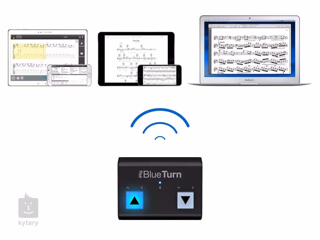 Das iRig Blue Turn ist kompatibel mit iPhone/iPad, Mac und Android-Geräten. Die Tasten senden eine HID-Nachricht an ein synchronisiertes Gerät mit Bluetooth LE-Technologie. Dies funktioniert mit allen gängigen Apps zum Umblättern oder Anzeigen von Dokumenten, einschließlich Adobe Reader oder der IK-eigenen App iKlip Stage.