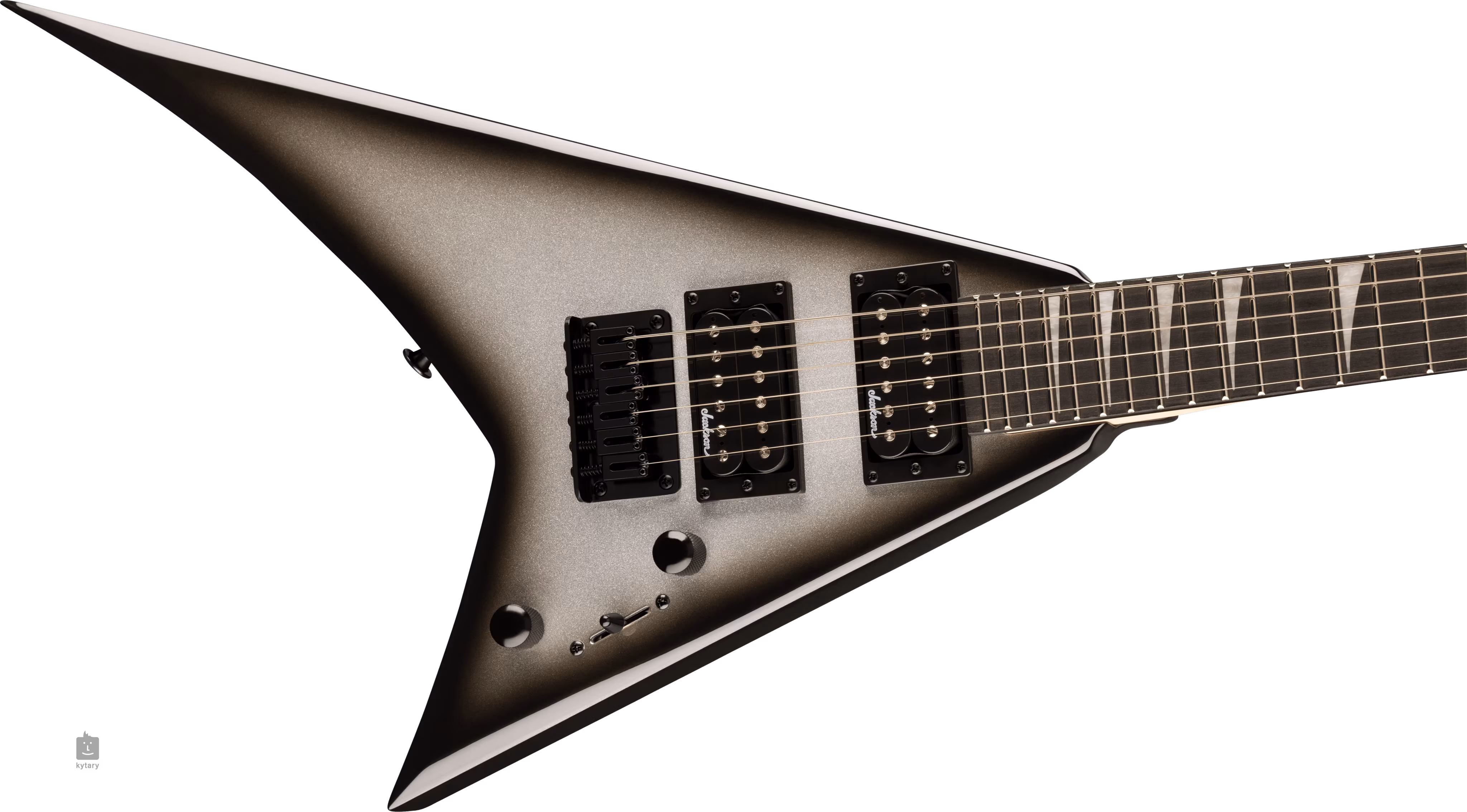 Der Korpus der JS1X RR Minion Silverburst ist aus Pappelholz gefertigt. Der geschraubte Ahornhals ist mit einem Griffbrett aus Amaranth (Purpleheart) verleimt, das mit vierundzwanzig Jumbo-Bünden ausgestattet ist. Positionsmarkierungen aus Perlmuttimitat vom Typ Sharkfin erleichtern die Orientierung auf dem Griffbrett.