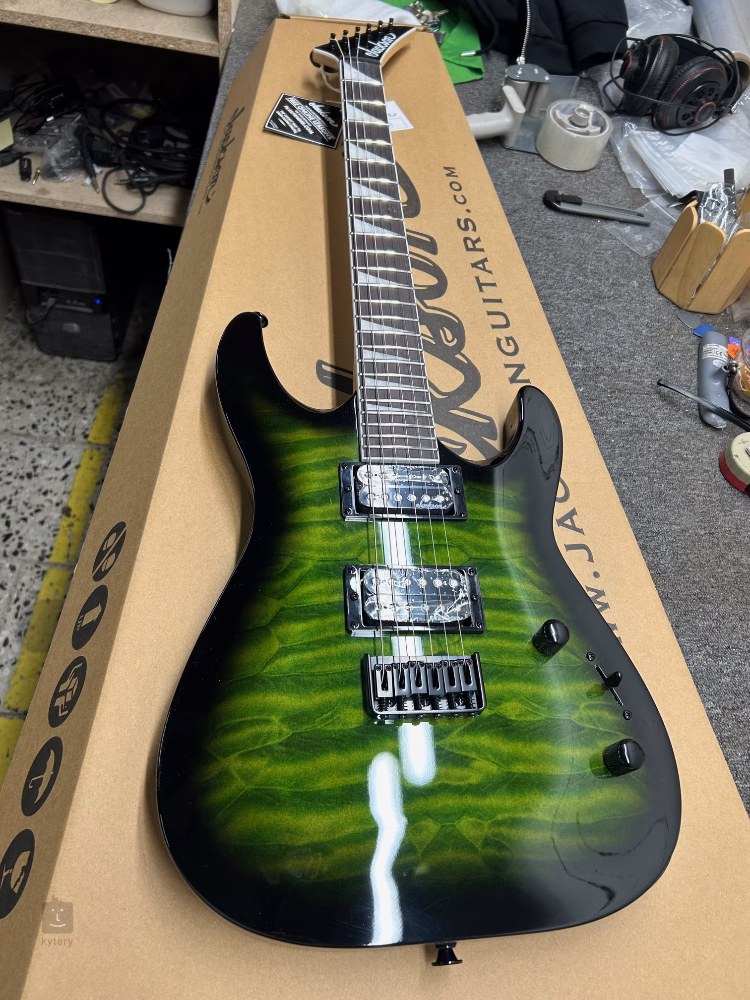 Die JS-Serie bietet erschwingliche E-Gitarren mit allen typischen Merkmalen der Jackson-Instrumente, die Sie mit dieser Marke und verschiedenen Formen der Rock- oder Metal-Musik verbinden. Insbesondere die Modelle mit der Bezeichnung Dinky bieten die beliebte Superstrat-Korpusform. Der Espenholz-Korpus der JS32 Dinky Arch Top HT AMR TGB mit gewölbter Decke (Archtop) ist mit einem Furnier aus Riegelahorn mit auffälliger Maserung verziert, die durch die Lackierung in Transparent Green Burst noch verstärkt wird. An den verschraubten Ahornhals, der mit einer Graphitverstärkung verstärkt ist, ist ein Griffbrett aus Amaranth (Purpleheart) mit 24 Jumbo-Bünden geklebt. Sein Radius flacht zum Korpus hin ab und ermöglicht so sowohl komfortables Spielen von Riffs am Nullbund als auch komfortables, ultraschnelles Shredding in höheren Lagen. Die Orientierung auf dem Griffbrett erleichtern Positionsmarkierungen aus Sharkfin-Imitatperlmutt (Haifischflosse). Zwei firmeneigene Humbucker mit Keramikmagneten und hohem Ausgangssignal verleihen der Gitarre einen satten Klang, der in der Metal- und Rockmusik so dringend benötigt wird. Zur Klangregelung dienen Lautstärkeregler, Klangregler und ein dreistufiger Pickup-Schalter. Die Saiten sind in firmeneigenen Die-Cast-Stimmmechaniken und über den festen HT-6-Steg durch den Korpus des Instruments befestigt. Die E-Gitarren der amerikanischen Marke Jackson sprechen seit mehreren Jahrzehnten vor allem Musiker aus Metal-, Metalcore-, HC- oder Djent-Bands an, die einen lauten Sound mit mehr oder weniger aggressiven Elementen bevorzugen, was auch die Liste der firmeneigenen Musiker belegt.
