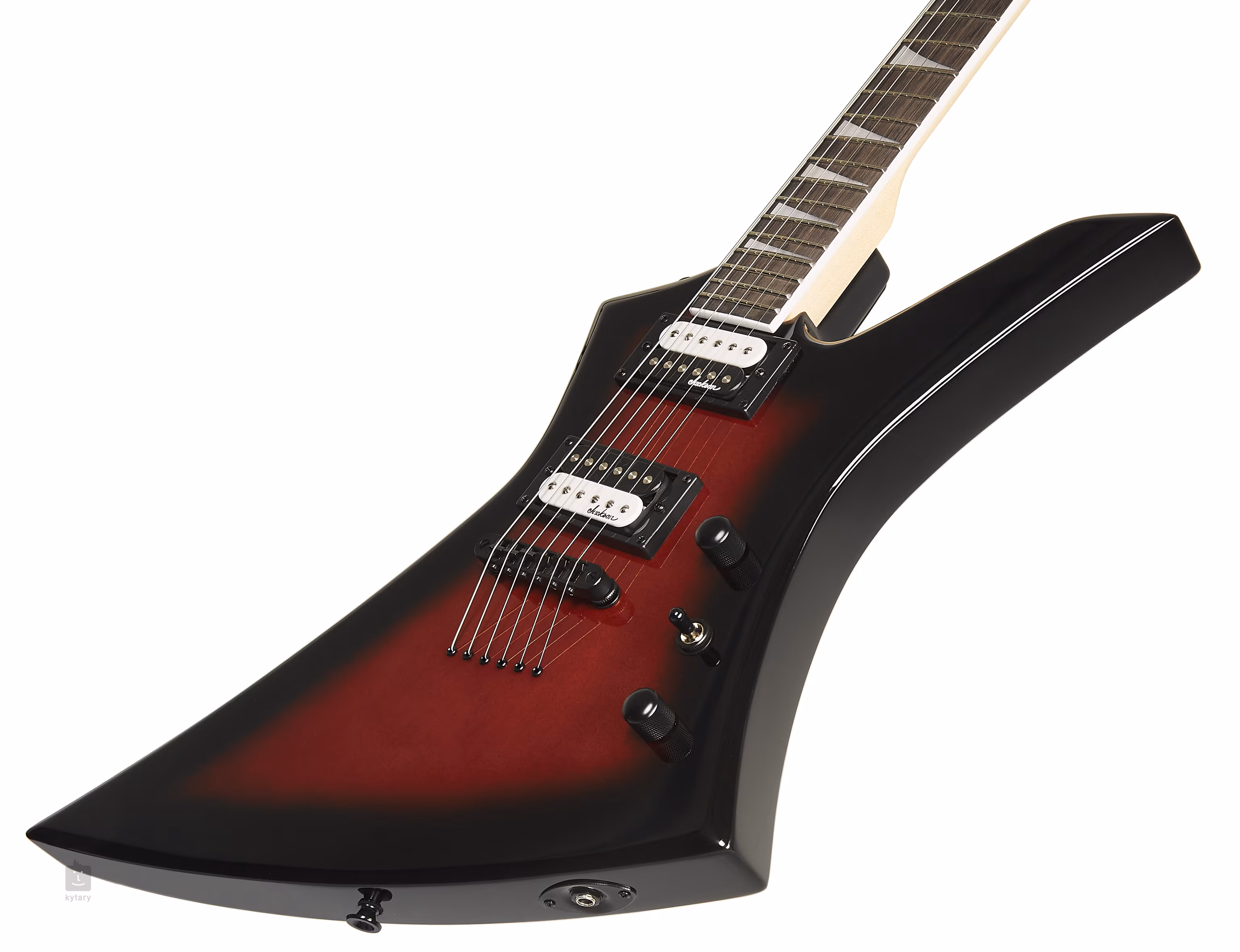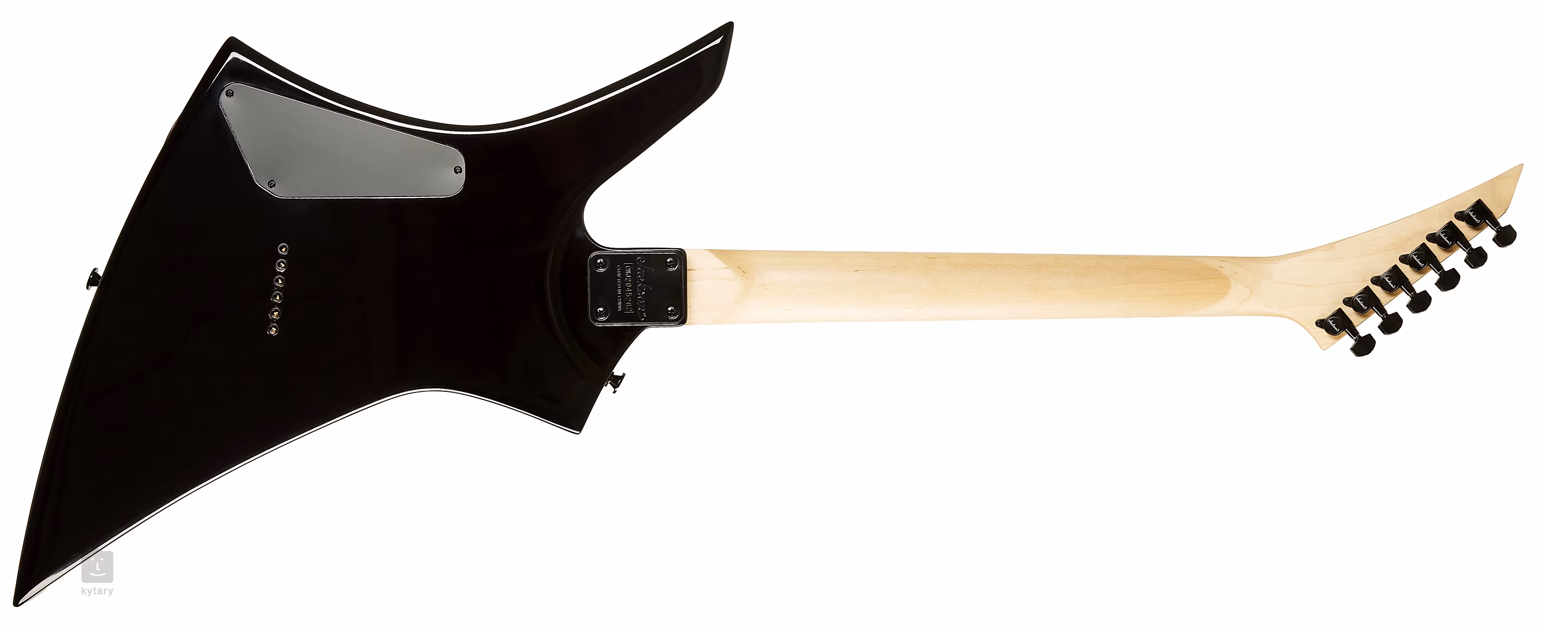 Die Saiten werden über einen festen Steg mit einstellbarer Saitenhöhe durch den Korpus geführt. Auf der anderen Seite sind die Saiten in Jacksons die-cast-Mechaniken montiert. Die Hardware ist schwarz.