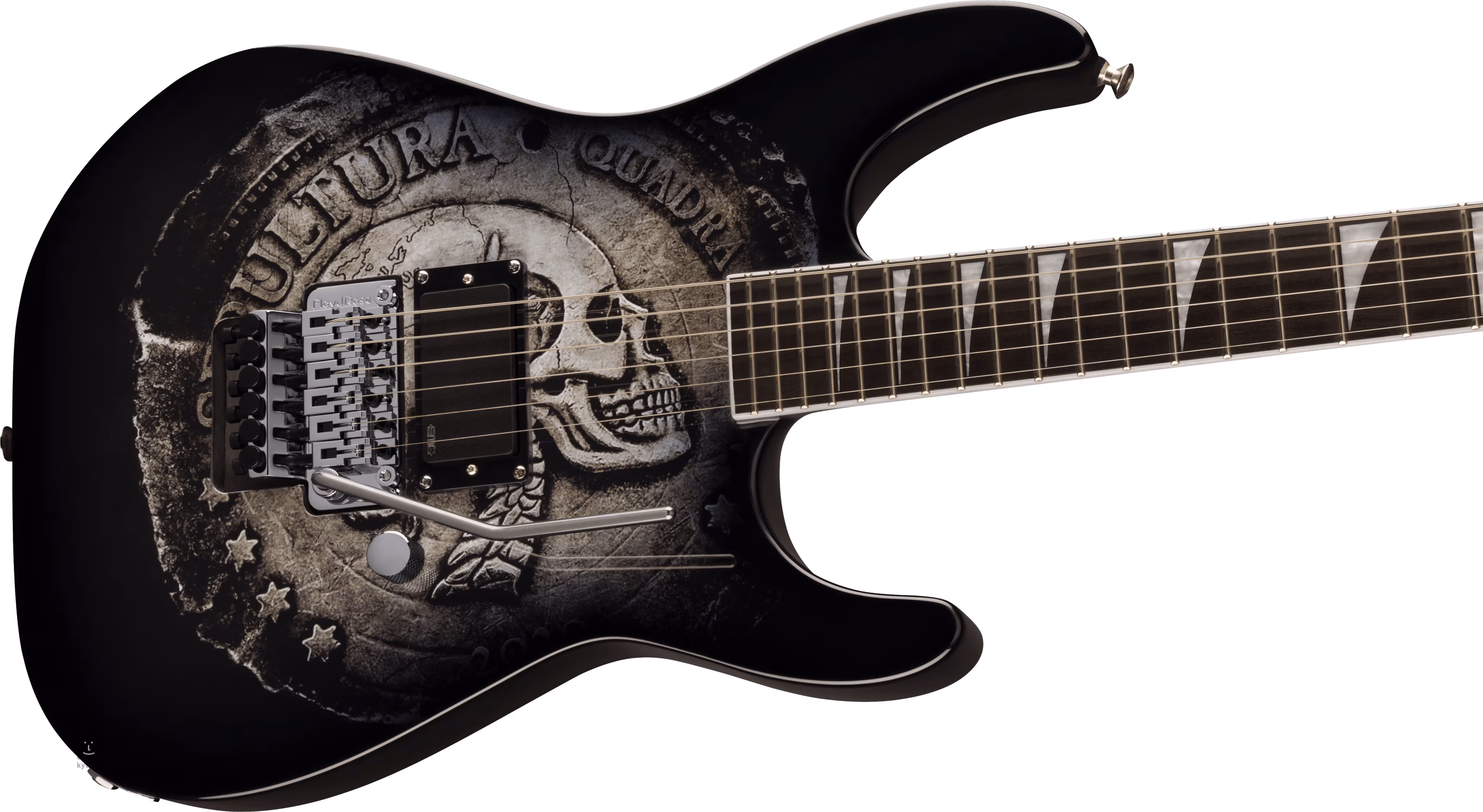 Ein aktiver EMG 81 Cobbler-Humbucker verleiht dem Sound des Instruments die nötige Fülle und präzise Artikulation für Gesangssoli oder Akkord-Breakdowns, liefert aber auch die Dichte und Aggressivität für ultraschnelles Gitarrenshredden und scharfkantige Rock- und Metal-Riffs. Die Bedienelemente beschränken sich auf ein Lautstärkepotentiometer. Die Saiten sind in den hauseigenen Mechaniken und dem Floyd Rose 1000 Series Tremolo untergebracht. Das stilvolle Finish wird durch verchromte Hardware akzentuiert.