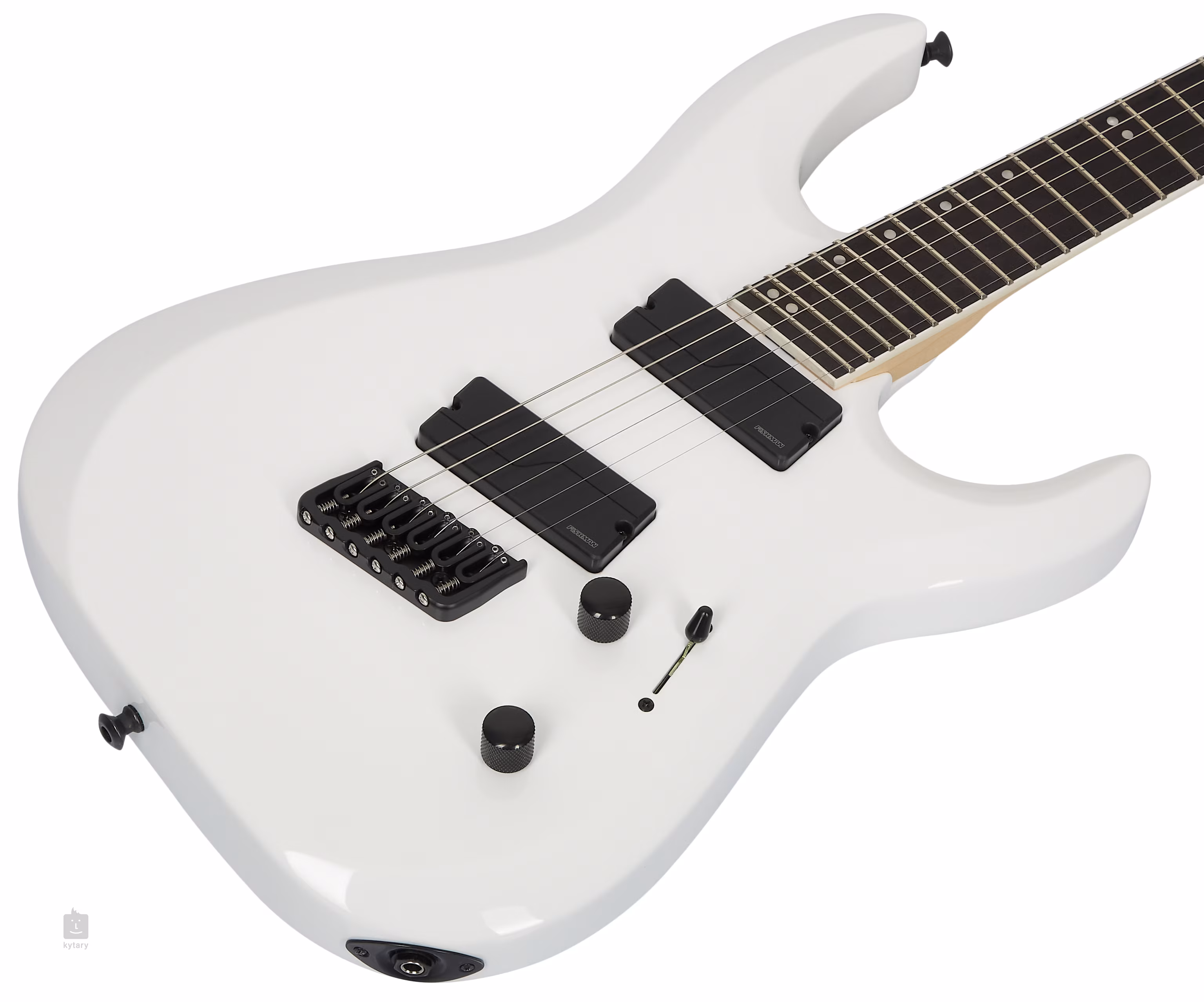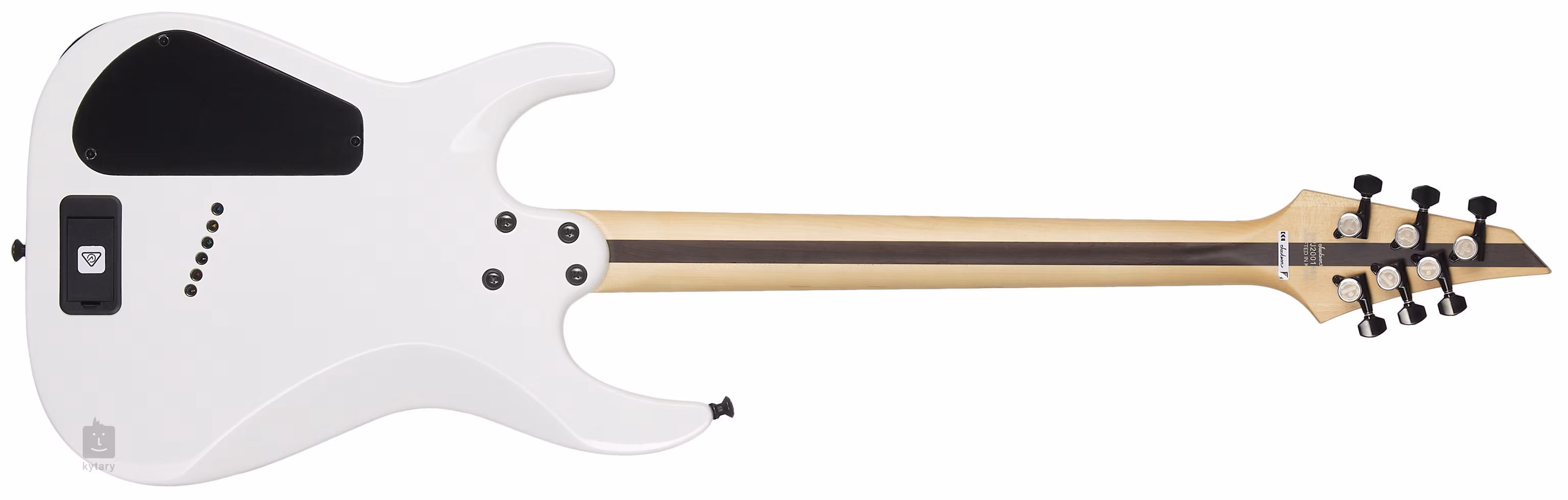 Der Korpus dieser Gitarre ist aus Linde gefertigt. Ein Ebenholz-Griffbrett mit vierundzwanzig Jumbo-Bünden ist auf einen verschraubten Hals mit Graphit-Beleistung geklebt, der aus zwei Ahornteilen und einem Wenge-Mittelteil besteht. Das derzeit beliebte Multi-Scale-Konzept, d.h. das Griffbrett ist mit diagonal angeordneten Bünden ausgestattet, verleiht dem Instrument eine variable Menzatura (648 mm - 673 mm) und den Saiten eine optimale Spannung. Nach Meinung einiger Musiker ist auch die Bewegung der Hand auf dem Griffbrett natürlicher. Der kombinierte Radius des Griffbretts ermöglicht sowohl komfortables Riffing am Nullbund als auch bequemes, ultraschnelles Shredden in höheren Lagen. Die Orientierung auf der Griffbrettoberfläche wird durch versetzte Positionsmarkierungen aus Perlmuttimitat und Leuchtpunkte an der Seite erleichtert, so dass Sie auch in den dunkelsten Bereichen der Bühne perfekt gesehen werden.