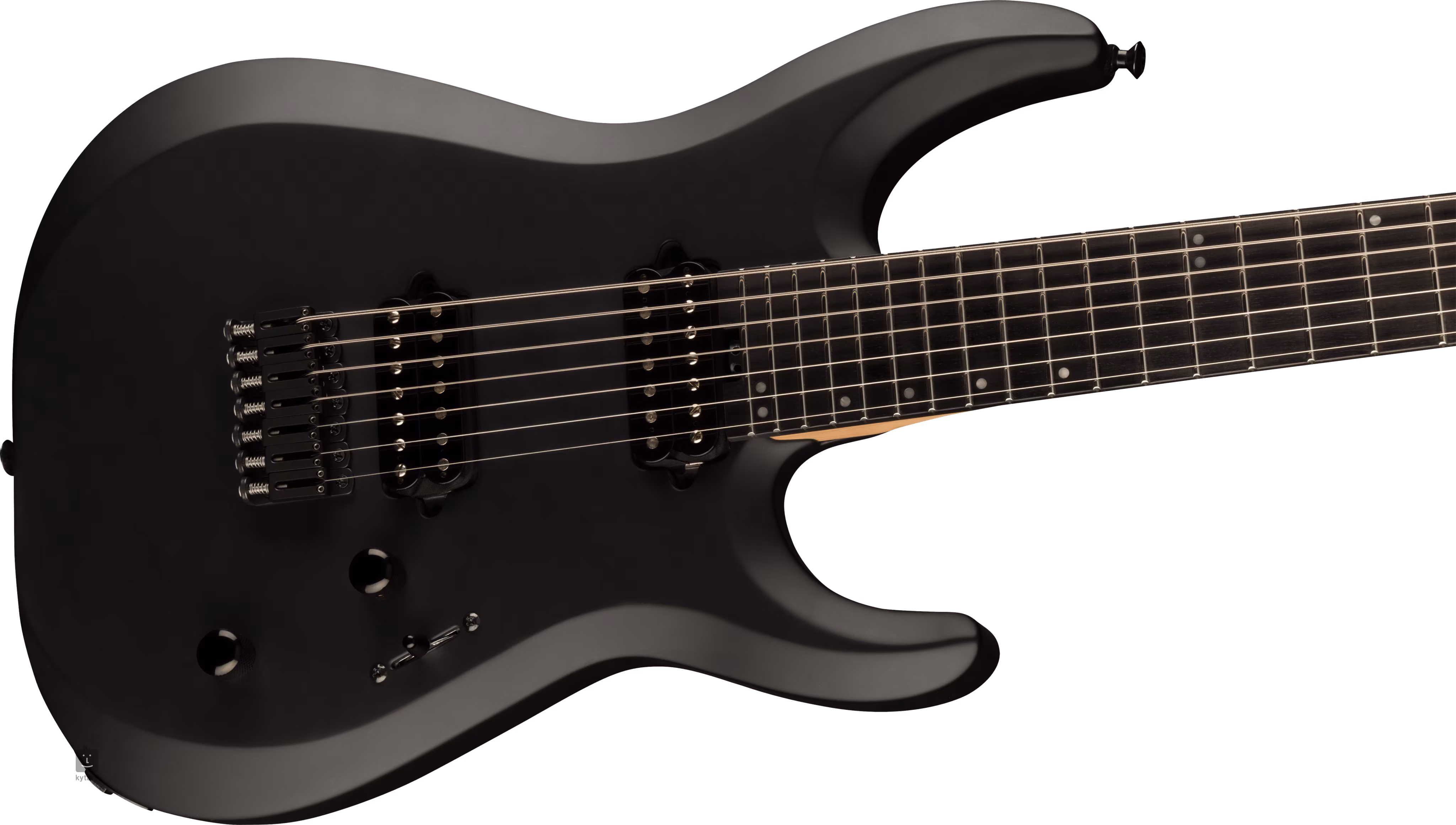Der Korpus der siebensaitigen E-Gitarre der Pro Plus Serie DK Modern MDK7 HT Satin Black ist aus Linde gefertigt. Ein Ebenholz-Griffbrett mit vierundzwanzig Jumbo-Bünden aus rostfreiem Stahl ist auf einen verschraubten dreiteiligen Hals aus Ahorn und Walnuss geklebt, der mit Graphitstreben verstärkt ist. Die Orientierung auf der Griffbrettoberfläche wird durch versetzte Positionsmarkierungen aus Perlmuttimitat und seitliche Leuchtpunkte erleichtert, die auch in den dunkelsten Ecken der Bühne für perfekte Sicht sorgen.