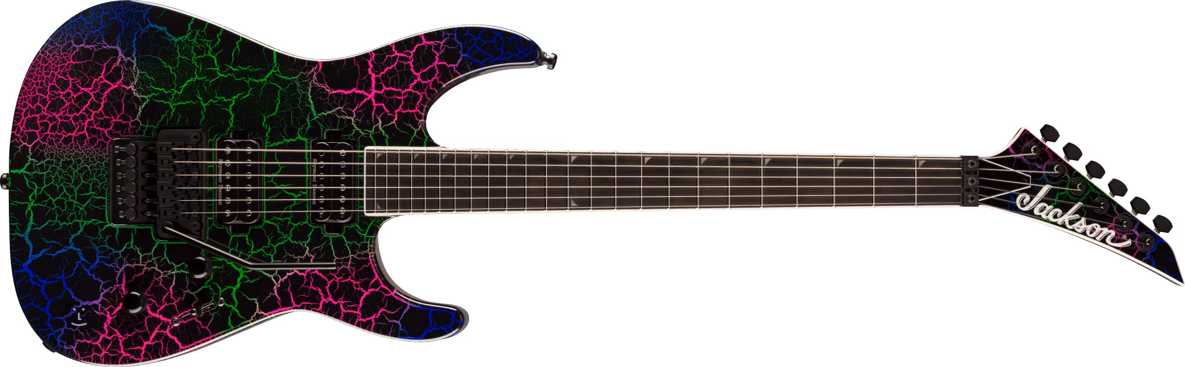 Die Konstruktion der Jackson Pro Plus Series Soloist SL2 Bruised Crackle Gitarre besteht aus einem ergonomisch geformten Okoumé-Korpus und einem durchgehenden Hals aus drei Teilen Ahorn und Nussbaum, der mit Graphitstreben verstärkt ist. Diese Konstruktion wirkt sich positiv auf das Sustain des Instruments aus. Das Ebenholz-Griffbrett ist mit vierundzwanzig Jumbo-Bünden aus Edelstahl ausgestattet. Der kombinierte Radius des Griffbretts ermöglicht sowohl komfortables Riffspiel am Nullbund als auch bequemes ultraschnelles Shredden in höheren Lagen. Positionsmarkierungen aus Perlmuttimitat (Piranha-Zahn) und Leuchtpunkte an der Seite erleichtern die Orientierung auf dem Griffbrett und sorgen für perfekte Sichtbarkeit auch in den dunkelsten Bereichen der Bühne.