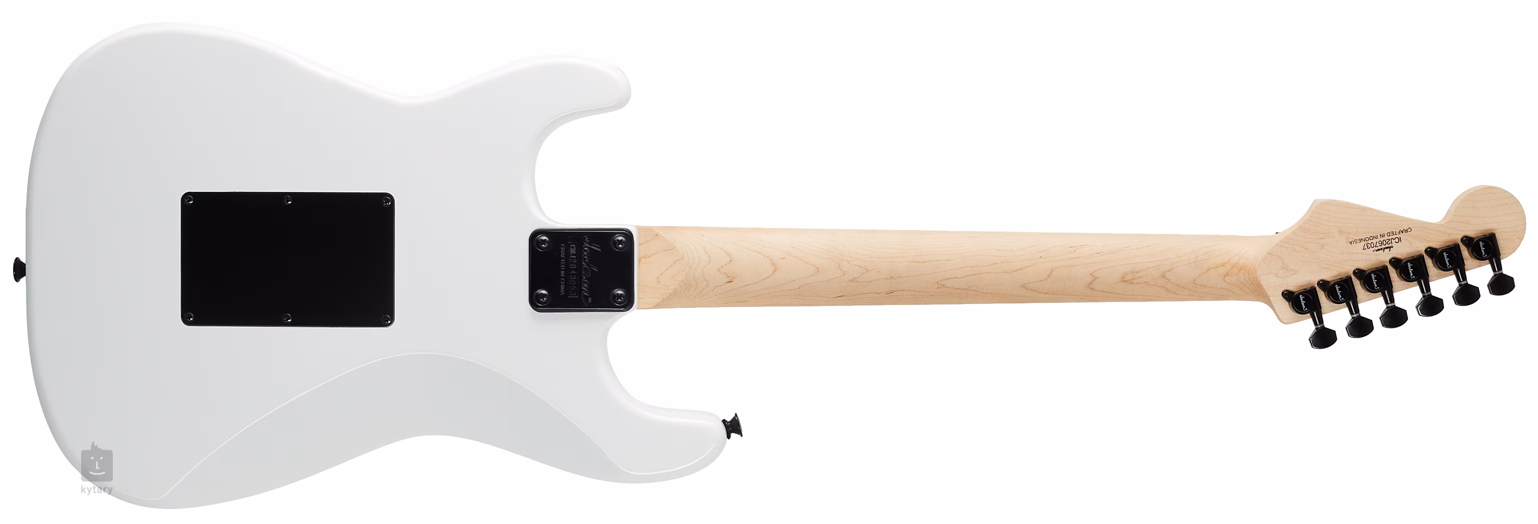 Die Saiten sind in einem Floyd-Rose-Tremolo mit zwei Schlössern verankert, auf der anderen Seite sind sie in Jackson-Präzisionsmechaniken gelagert. Natürlich gibt es einen abschließbaren Nullbund. Egal, was auf dem Griffbrett passiert, diese Anordnung sorgt dafür, dass die Gitarre perfekt gestimmt ist. Ein einlagiges Schlagbrett schützt den Korpus vor Pick-Angriffen.