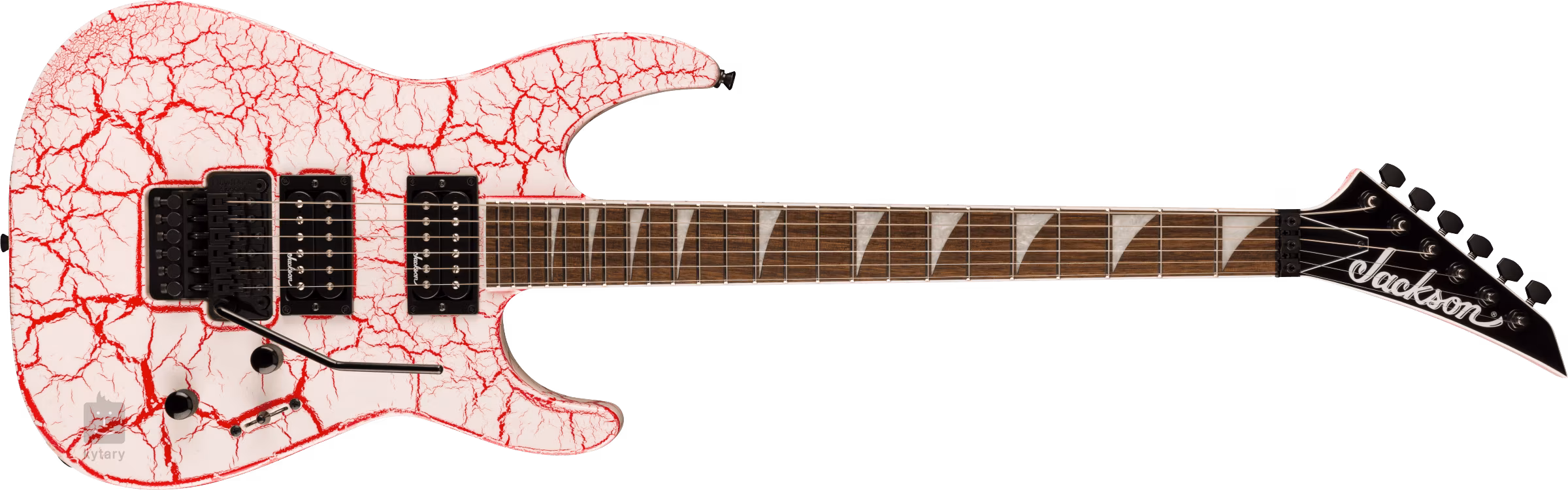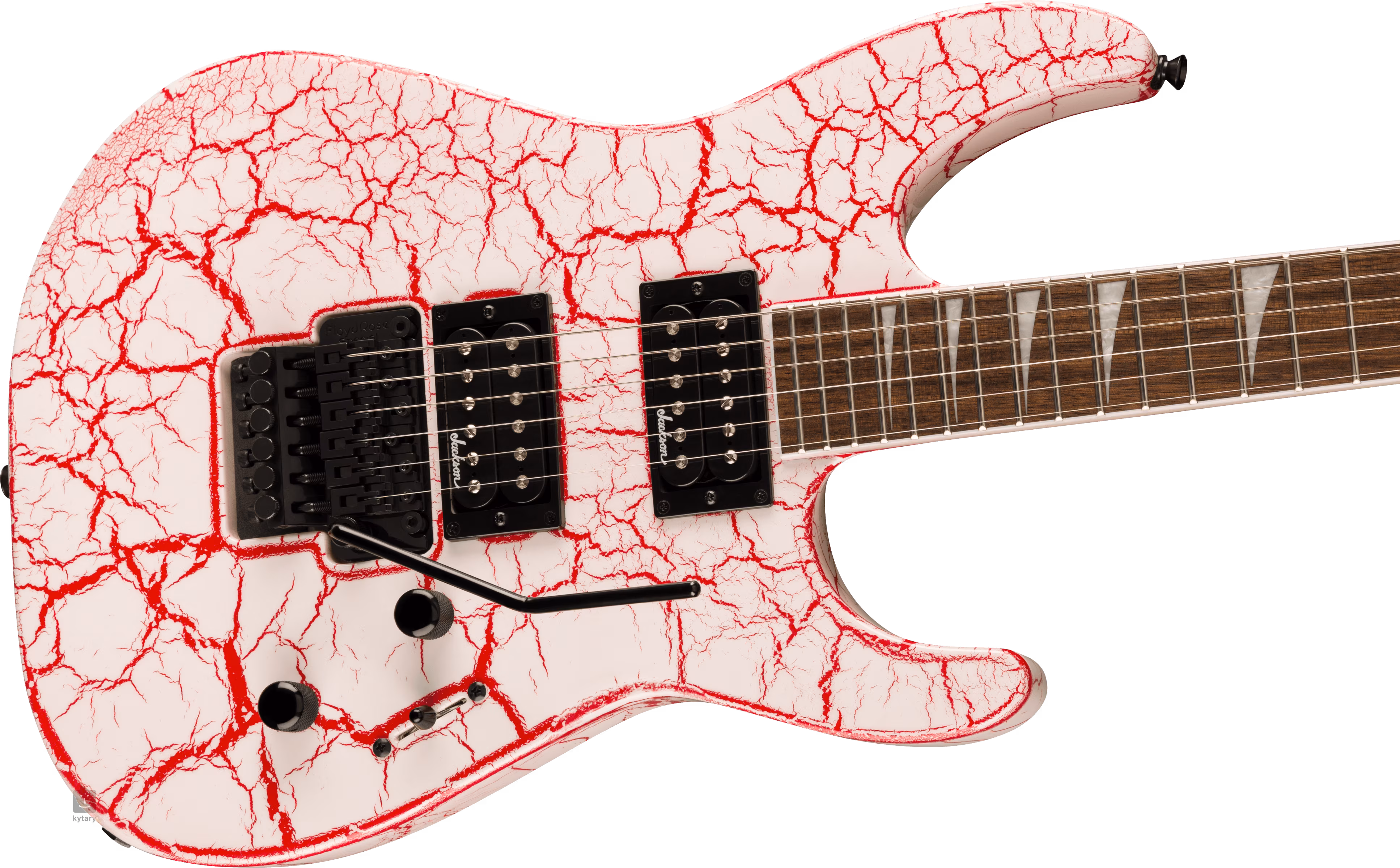 Zwei proprietäre High-Output-Humbucker verleihen der Gitarre den saftigen Sound, der in der Metal- und Rockmusik so wichtig ist. Lautstärkepotentiometer, Tonregler und ein dreistufiger Pickup-Schalter dienen der Klanganpassung. Die Saiten sind in den hauseigenen Druckguss-Stimmmechaniken und dem Floyd Rose Special-Tremolo untergebracht, mit dem du deinem Spiel beeindruckende Klangeffekte verleihen kannst. Das stilvolle Finish wird durch das Bloodshot Crackle-Finish und schwarze Hardware akzentuiert.