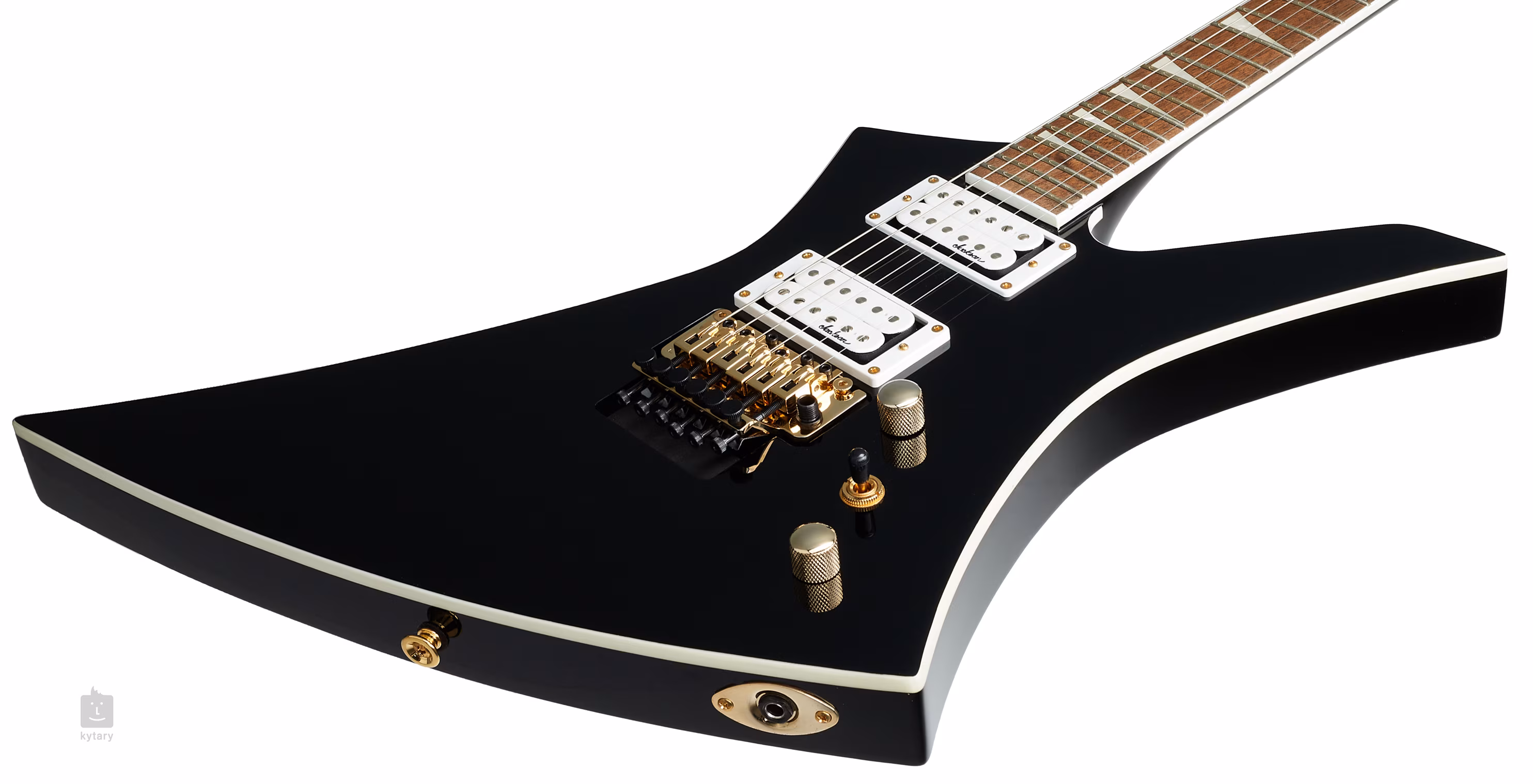 Zwei proprietäre High-Output-Humbucker verleihen der Gitarre den saftigen Sound, der in der Metal- und Rockmusik so wichtig ist. Lautstärkepotentiometer, Tonregler und ein dreistufiger Tonabnehmerschalter dienen der Klanganpassung. Die Saiten sind in den die-cast-Stimmmechaniken des Unternehmens und einem Floyd-Rose-Tremolo mit doppelter Umkehrung untergebracht, mit dem Sie Ihrem Spiel beeindruckende Klangeffekte verleihen können. Die Stabilität der Stimmung bei häufigem Gebrauch des Hebels wird durch Sperren am Nullbund gewährleistet. Der stilvolle Look der Gitarre wird durch die glänzend schwarze Korpuslackierung, das weiße Binding an Korpus, Hals und Kopfplatte sowie die Hardware in beeindruckendem Gold-Finish unterstrichen.
