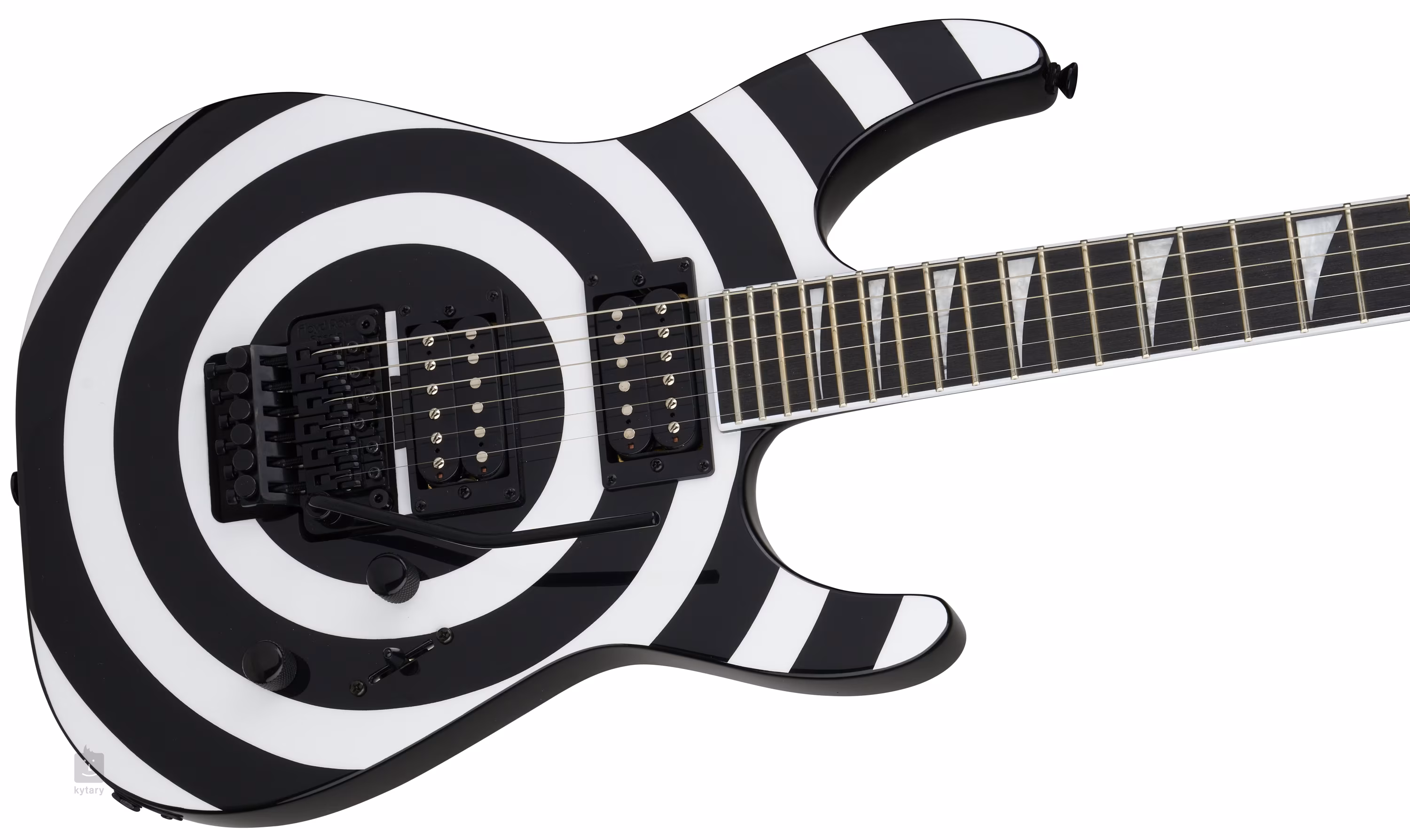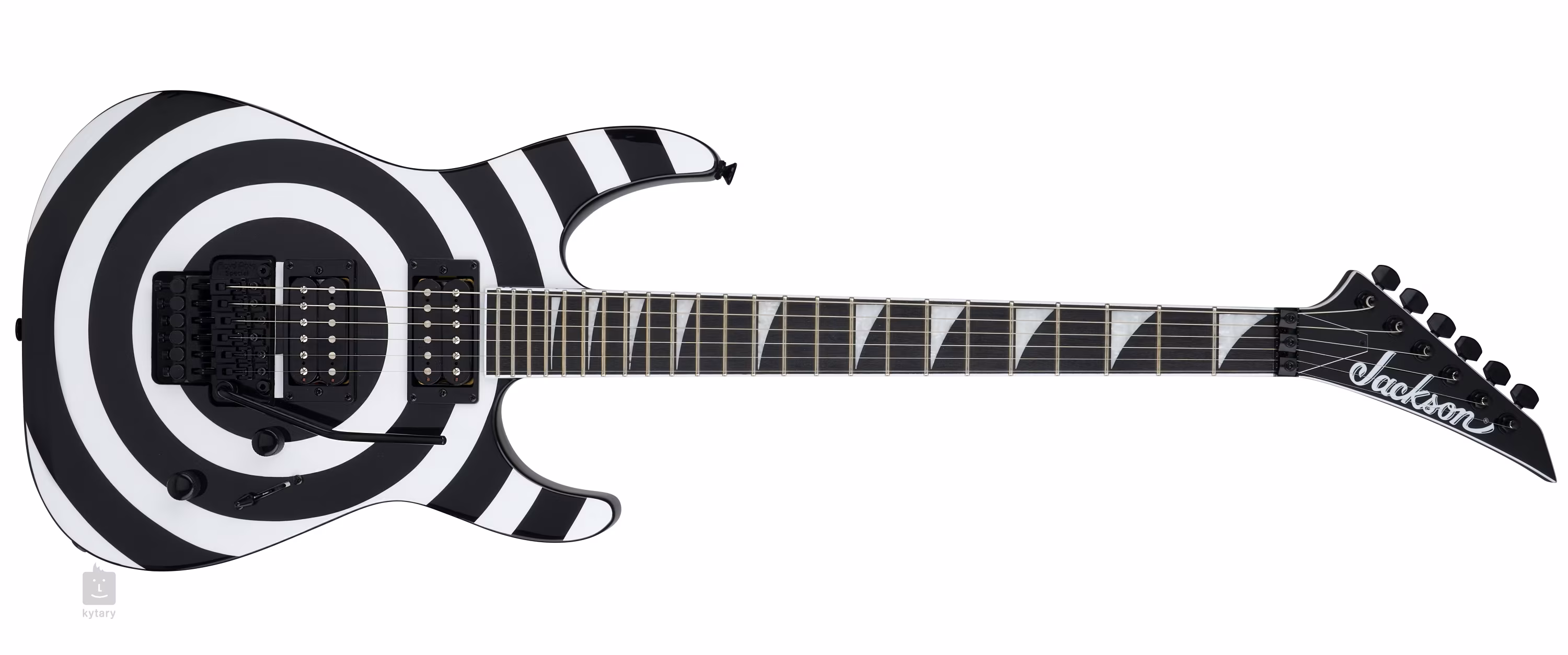Zwei proprietäre High-Output-Humbucker verleihen der Gitarre einen vollen, aggressiven Sound, der sich bei geladenen Powerchords, schnell phrasierten Gitarrenriffs und Soli im Hard- und Heavy-Stil auszeichnet. Mit den Lautstärke- und Tonreglern und dem dreistufigen Pickup-Schalter lassen sich die Konturen des Sounds zähmen. Die Saiten sind in der Druckguss-Mechanik und dem Floyd Rose Special Tremolo des Unternehmens montiert. Verriegelungen am Nullbund sorgen dafür, dass die Gitarre auch bei häufigem Gebrauch des Tremolohebels gestimmt bleibt.