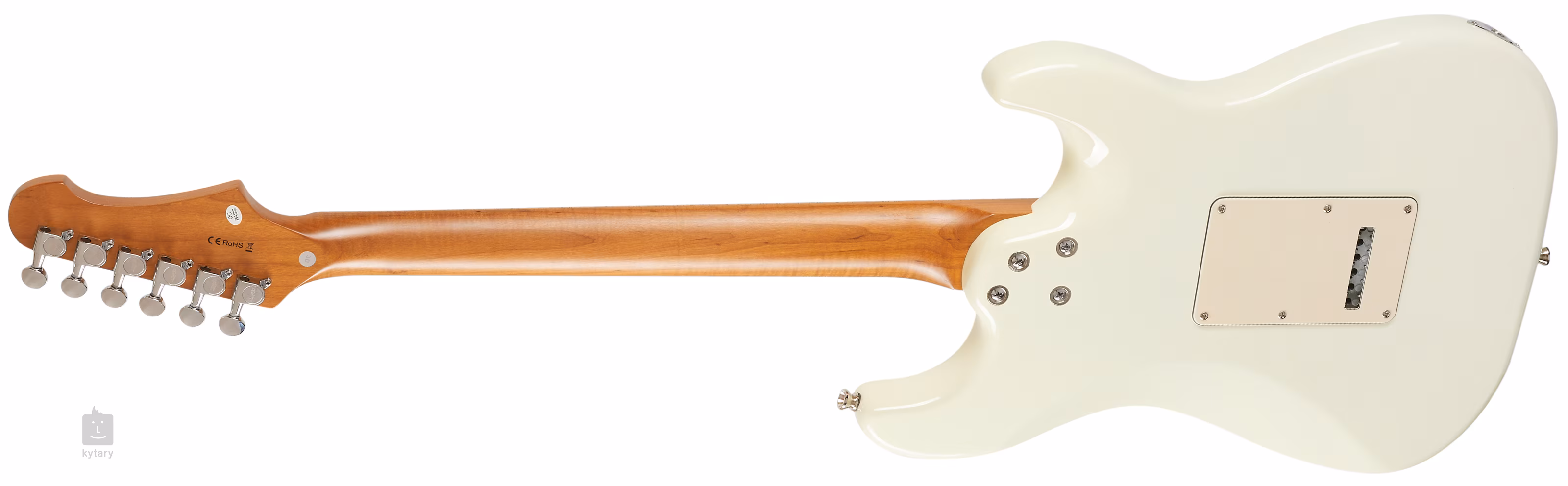 Die JET JS400 WH LH ist eine linkshändige E-Gitarre, die das Design, die Verarbeitung und die traditionellen Elemente der ST-Modelle zu einem erschwinglichen Preis bietet. Der Lindenholz-Korpus des Instruments ist mit einem glänzenden Lack überzogen. Der geschraubte Hals aus kanadischem Ahorn und das Griffbrett des Instruments wurden vor der Montage einer Wärmebehandlung unterzogen, wodurch das Holz stabiler wird und gleichzeitig das Aussehen/die Ausstrahlung von seit Jahren gespielten Hälsen/Griffbrettern erhält. Die Kombination aus einem Humbucker-Steg-Tonabnehmer und zwei Single-Coil-Tonabnehmern mit Keramikmagneten verleiht der Gitarre eine breite Klangpalette, die für eine Vielzahl von Musikgenres geeignet ist. Der Klangcharakter kann mit dem Lautstärkeregler, dem Tonregler und dem Fünf-Wege-Tonabnehmerwahlschalter gestaltet werden. Die Saiten sind über den Nulldeckel aus Knochen in verchromten Stimmmechaniken und einem synchronisierten Tremolo verankert. Das stilvolle Aussehen der Gitarre wird durch ein weißes Schlagbrett unterstrichen. Die relativ neue Marke Jet Guitars bietet erschwingliche E-Gitarren in traditionellen Designs, Farben und Oberflächen an.