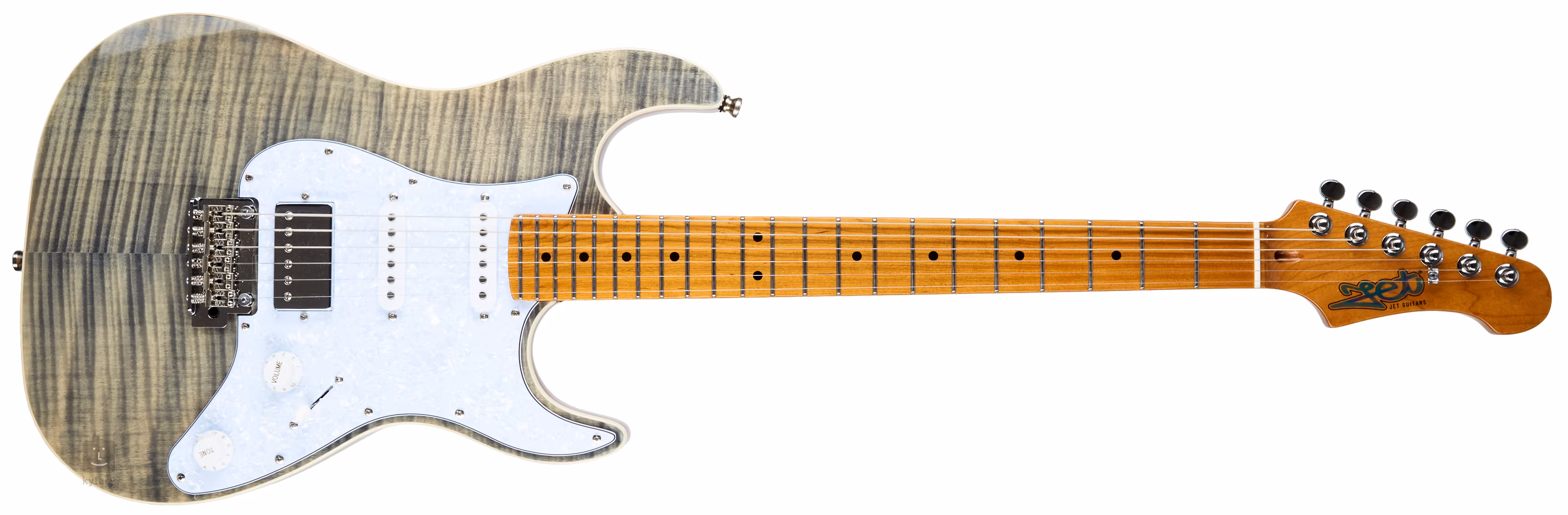 Die E-Gitarre JET JS-450 TBK ist ein moderneres ST/Super ST-Modell. Der Lindenholz-Korpus des Instruments ist mit einer effektvollen Furnierdecke aus geflammtem Ahorn verziert, deren Maserung durch die Lackierung in Transparent Black besonders gut zur Geltung kommt. Der verschraubte Hals aus kanadischem Ahorn und das Griffbrett des Instruments wurden vor der Montage einer Wärmebehandlung unterzogen, wodurch das Holz stabiler wird und gleichzeitig das Aussehen/die Ausstrahlung von seit Jahren gespielten Hälsen/Griffbrettern erhält. Die Kombination aus einem Humbucker-Steg-Tonabnehmer und zwei Single-Coil-Tonabnehmern verleiht der Gitarre eine relativ breite Klangpalette, die für eine Vielzahl von Musikstilen geeignet ist. Der Klangcharakter kann mit Hilfe von Lautstärkereglern, Tonreglern und einem Fünf-Positionen-Tonabnehmerwahlschalter gestaltet werden. Die Saiten sind über den Nullsattel aus Knochen in verchromten, abschließbaren Stimmmechaniken und einem synchronisierten Tremolo verankert. Das stilvolle Aussehen der Gitarre wird durch ein weißes Schlagbrett unterstrichen. Die relativ neue Marke Jet Guitars bietet preisgünstige E-Gitarren in traditionellen Designs, Farben und Lackierungen an.