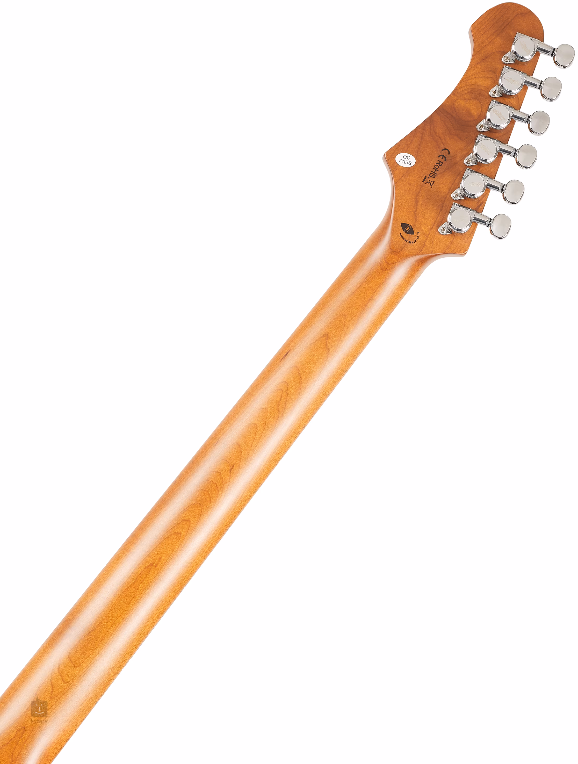 Zwei Humbucker mit Alnico-Magneten kümmern sich um das Soundsystem des Instruments. Der Klangcharakter lässt sich mit einem Volume-Potentiometer, Tone-Shutter und einem dreistufigen Pickup-Schalter formen. Die Verankerung der Saiten erfolgt über einen Knochenbund in verchromten Locking-Mechaniken und ein Zweipunkt-Tremolo. Das stilvolle Aussehen der Gitarre wird durch das Schlagbrett aus Perlmuttimitat noch unterstrichen.
