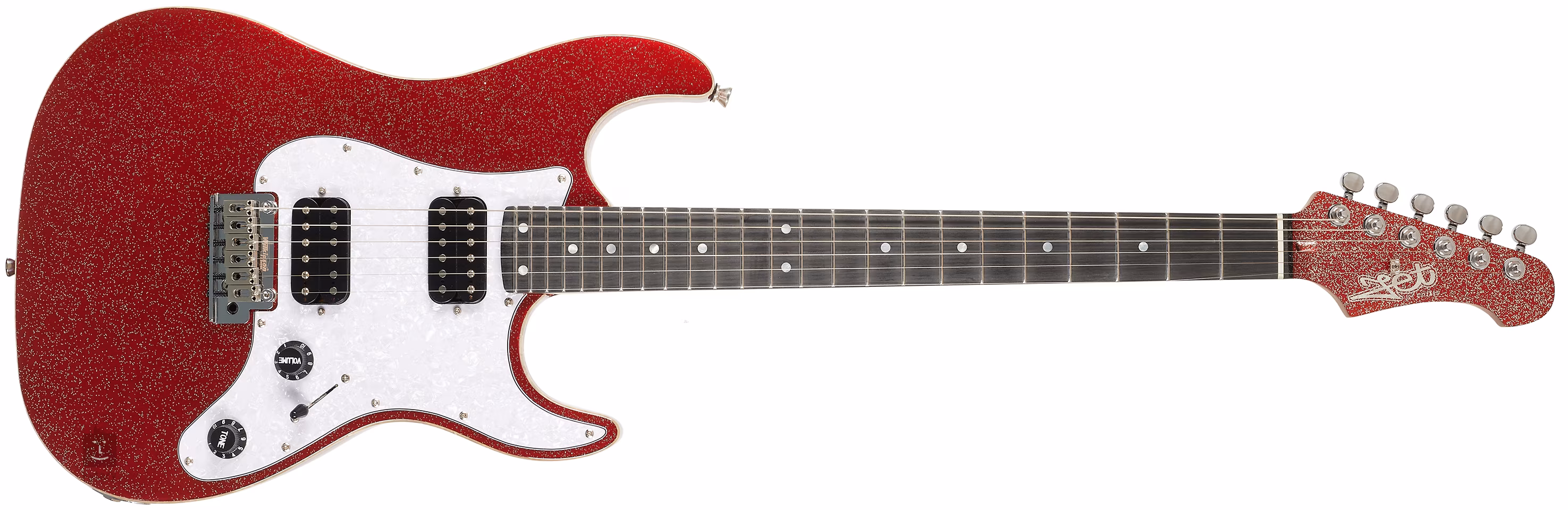 Die Jet JS-500 RDS kombiniert Elemente der klassischen ST und der moderneren Super ST Modelle. Der limonenfarbene Korpus des Instruments ist mit einer glänzenden Lackierung und glitzerndem Red Sparkle-Finish versehen. Ein gemischtes Ebenholzgriffbrett mit vierundzwanzig Bünden ist auf einen verschraubten Hals aus kanadischem Ahorn geklebt.