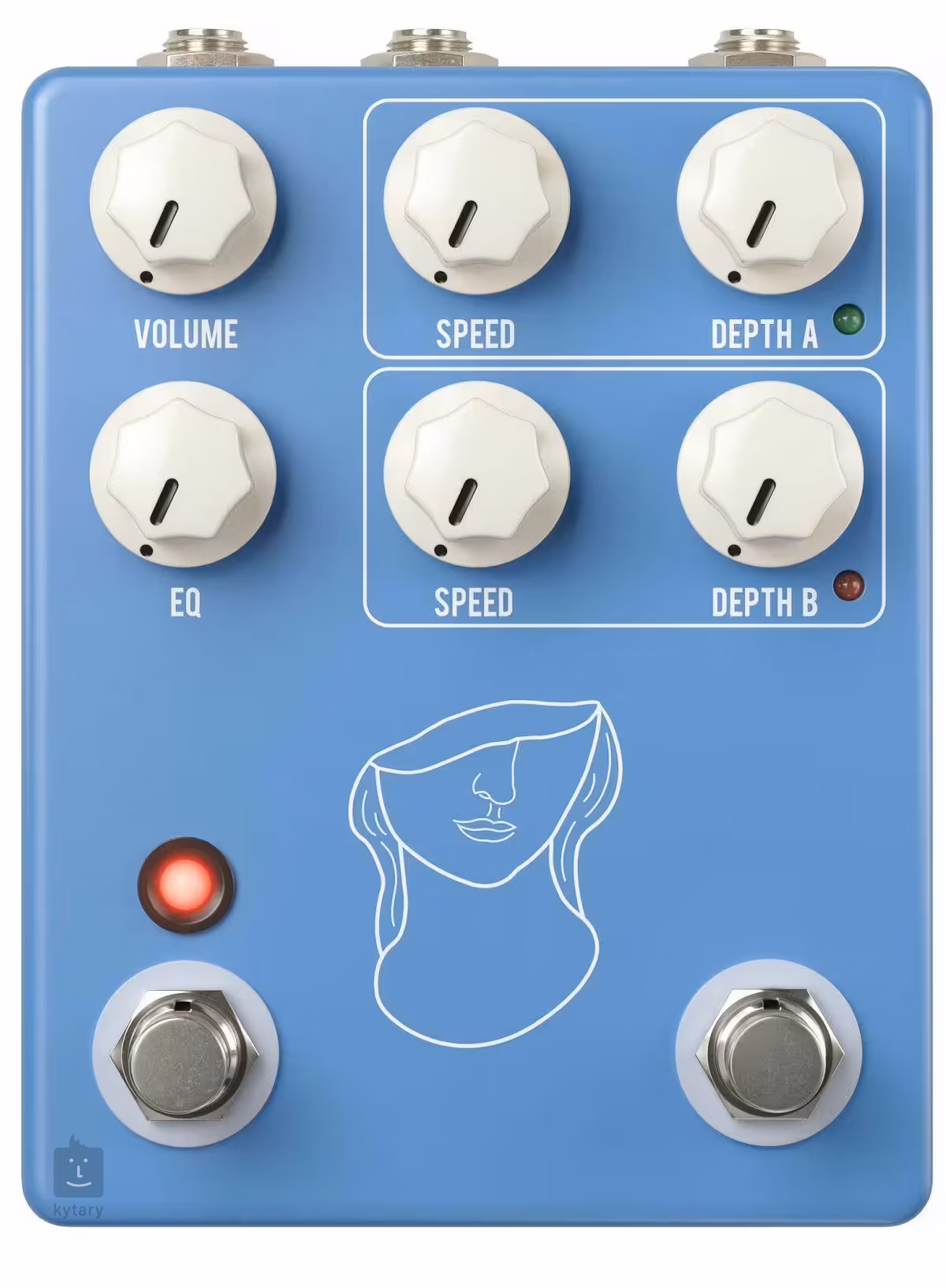 Das Pedal bietet eine einfache Bedienung. Es verfügt über ein Volume-Potentiometer zum Einstellen der Ausgangslautstärke, einen EQ zum Anpassen der Frequenzcharakteristik des Sounds und zwei Reglerpaare für Speed und Depth - Speed regelt die Geschwindigkeit des Vibratos und Depth seine Tiefe. Mit dem rechten Fußschalter können Sie ganz einfach zwischen den beiden verschiedenen Speed- und Depth-Einstellungen umschalten, während der linke Fußschalter zum Ein- und Ausschalten des Effekts verwendet wird, der als gepufferter Bypass verdrahtet ist. Die Box hat einen Eingang und zwei Ausgänge, so dass Sie einen dreidimensionalen Stereosound erzeugen können. Zur Stromversorgung wird ein 9V-Adapter benötigt, der nicht im Lieferumfang enthalten ist.