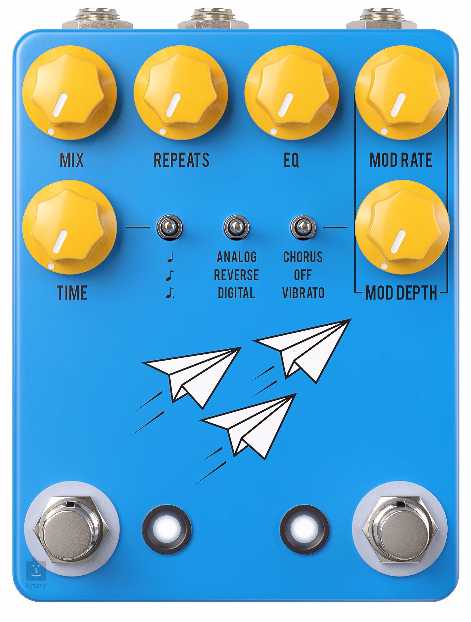 • Regler 2x FS (Bypass, Tap Tempo), Mix, Repeats, EQ, Time, Mod Rate, Mod Depth, Subdivision switch, Analog/Reverse/Digital switch, Chorus/Off/Vibrato switch