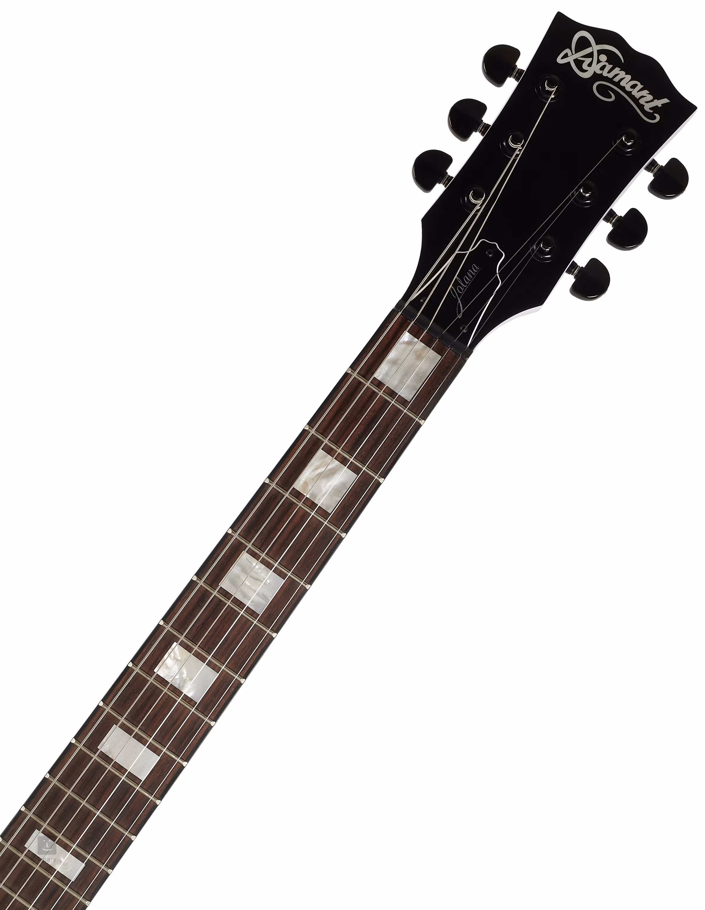 Der Mahagonikorpus der Diamant II AM BK RW WH E-Gitarre ist mit einer Solid White Gloss Lackierung versehen. Auf den Ahornhals ist ein Palisandergriffbrett mit zweiundzwanzig Medium-Jumbo-Bünden geleimt. Die Ausrichtung des Griffbretts wird durch Positionsblöcke erleichtert.