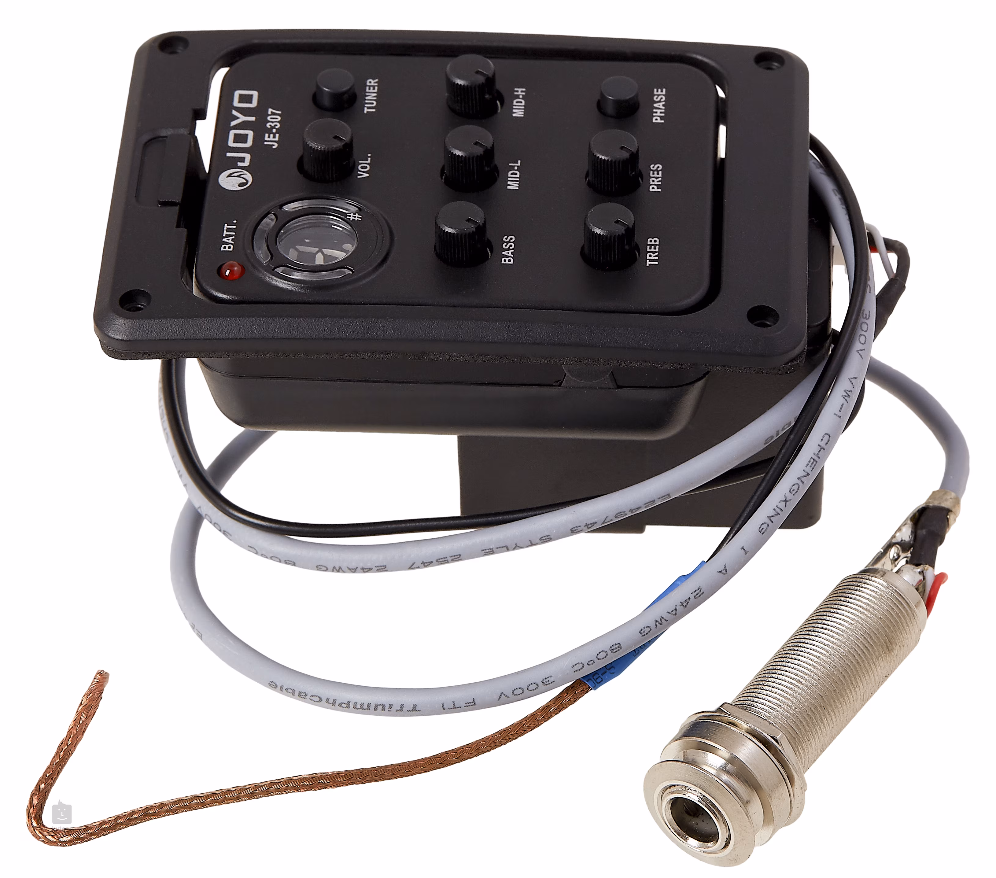Der Joyo JE-307 ist ein aktives Elektroniksystem, das für akustische Gitarren geeignet ist. Im Paket finden Sie einen aktiven Vorverstärker für den Einbau in die Rückseite des Instruments mit Fünfband-Equalizer, Lautstärkeregler, Phasenschalter, integriertem Stimmgerät und übersichtlichem Display, Batteriefach (9V) auf der Rückseite des Vorverstärkers, Piezo-Tonabnehmer, Ausgangsbuchse und Befestigungsschrauben. Für den Einbau des Vorverstärkers ist ein Ausschnitt von 62 mm x 46 mm erforderlich.