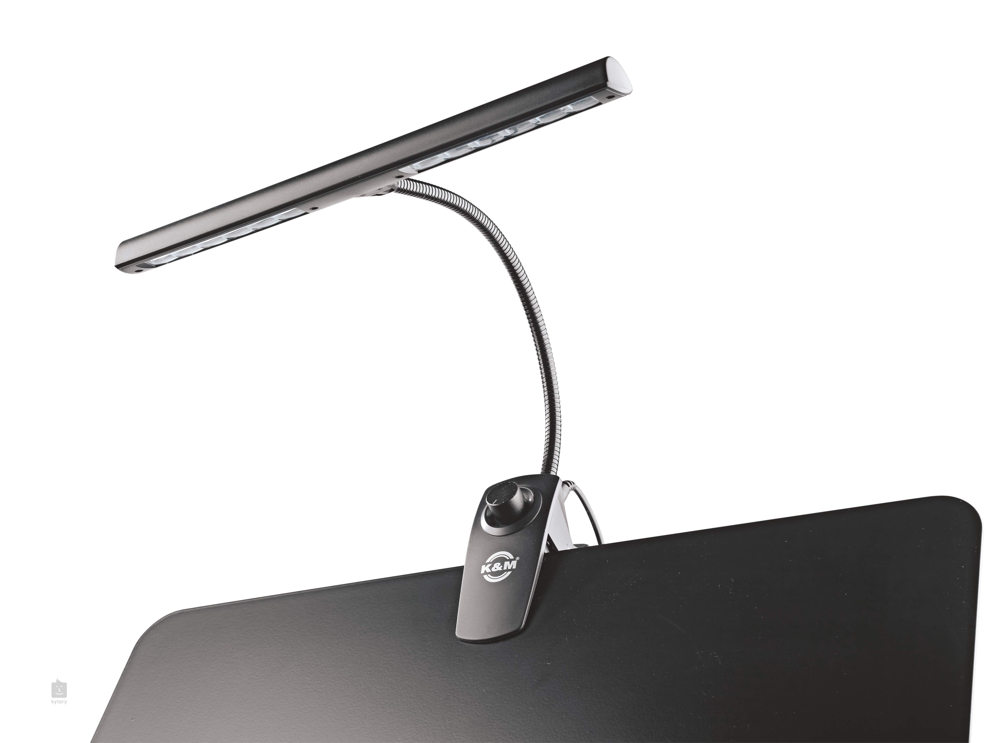 Notenstandleuchte der deutschen Marke König & Meyer mit zwölf leistungsstarken, aber energiesparenden LEDs. Die Lichtintensität ist stufenlos wählbar und mit dem flexiblen Schwanenhals können Sie den Lichtkegel ganz einfach genau so einstellen, wie Sie ihn brauchen. Die Länge des Lichtausschnitts beträgt 30 cm. Drei AA-Batterien und ein Netzadapter mit einem drei Meter langen Kabel sind im Lieferumfang enthalten. Die Lampe kann an alle Notenpulte, Tische und andere Platten mit einer maximalen Dicke von 2,5 cm angeklippt werden.