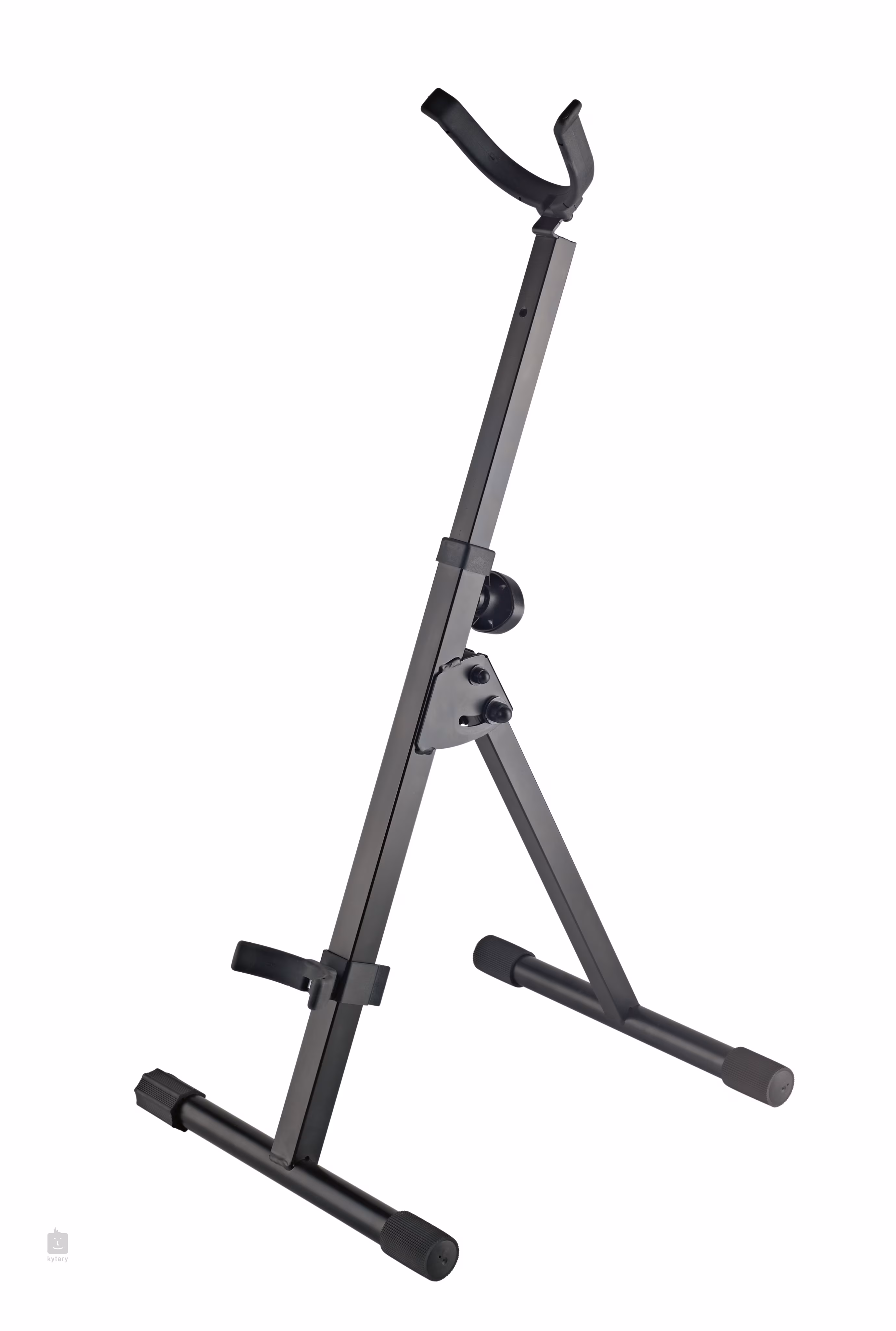 Stabiler, robuster Baritonsaxophonständer aus Stahl mit zweiteiliger Klappkonstruktion und verstellbarer Montagehöhe von 650 mm bis 920 mm. Alle Flächen, die mit dem Instrument in Berührung kommen, sind mit gummiertem Material überzogen, um Kratzer am Instrument zu vermeiden.