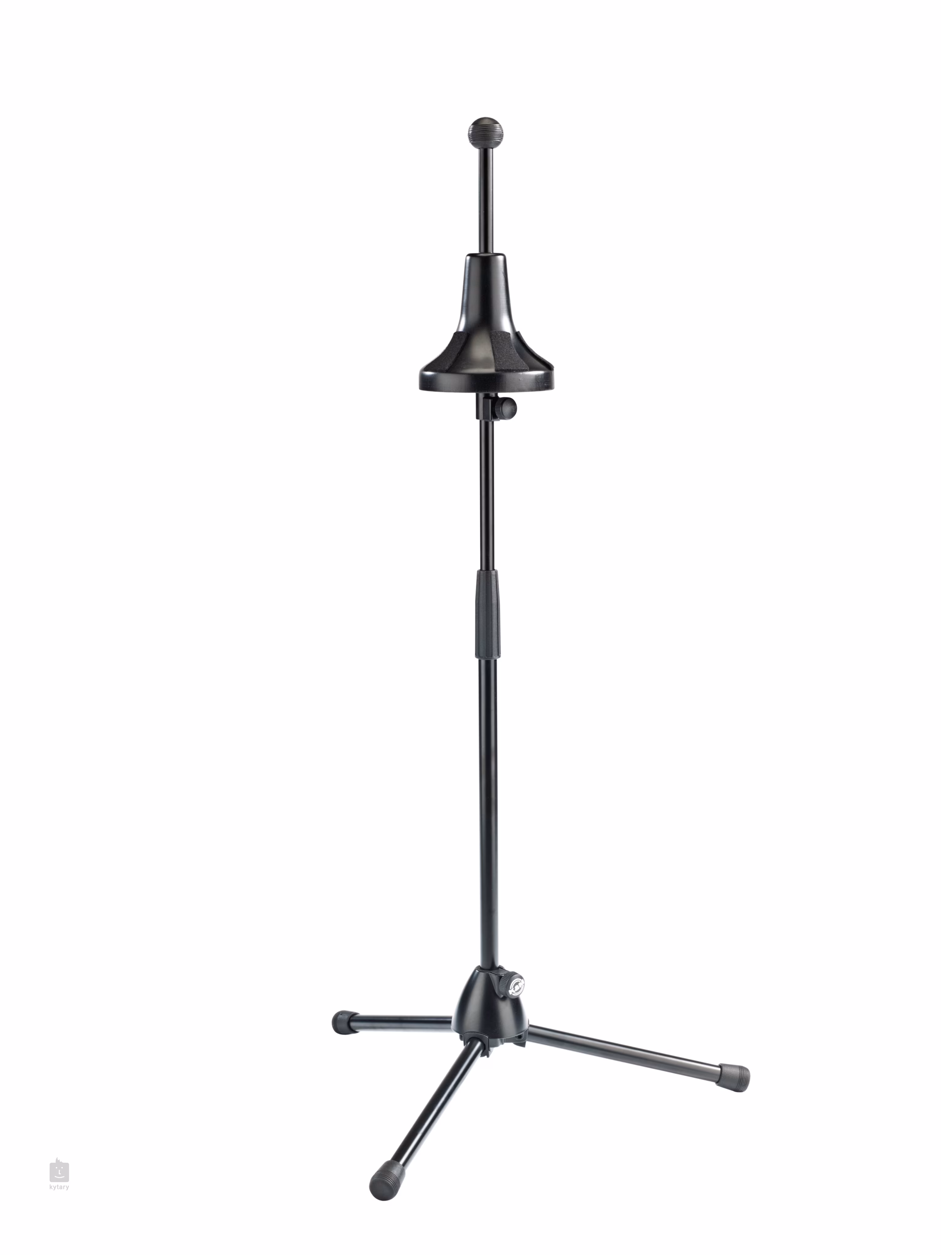 Bastposaunenständer aus Stahl mit Laminatboden und Höhenverstellung (650 bis 1140 mm). Die Teile, die mit dem Instrument in Berührung kommen, sind aus gummiertem Material, um Schäden an der Bastposaune zu vermeiden.
