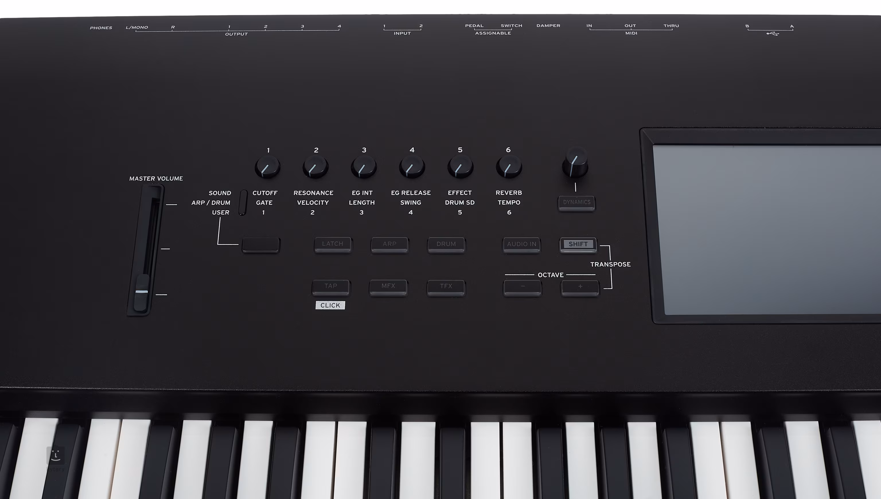 Sechs Echtzeit-Potentiometer ermöglichen die direkte Steuerung von PROG- und COMBI-Klangänderungen. Jedem ist eine bestimmte Anzahl von Funktionen zugewiesen, wie z.B. verschiedene Filter, Effektintensität, Gate-Time, Tempo und Swing-Arpeggiator Auswahl von Spuren, Instrumenten und anderen Optionen. Im COMBI-Modus können Sie verschiedene Instrumente gruppieren und ihre relativen Pegel steuern. Falls Sie die gewünschte Einstellung speichern möchten, können Sie die Potentiometer in das Bedienfeld drücken, um sie zu sperren und versehentliche Parameteränderungen während des Spiels zu verhindern.