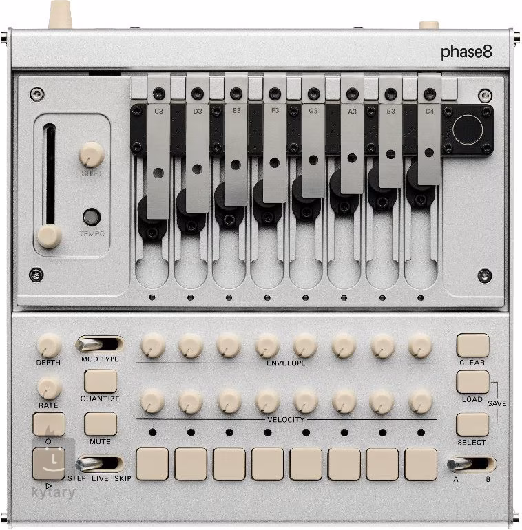 Die klanglichen Möglichkeiten des Phase8 sind dank seiner einzigartigen Konstruktion nahezu unbegrenzt. Das Instrument wird mit 13 chromatisch gestimmten Resonatoren geliefert, von denen Sie 8 gleichzeitig installieren können. Diese austauschbaren Resonatoren können Sie beliebig neu anordnen und stimmen, um so Ihre eigenen einzigartigen Tonleitern und Klangcharakteristika zu kreieren. Die wahre Magie entfaltet sich jedoch bei der physischen Interaktion – Sie können die Resonatoren zupfen, darauf klopfen, verschiedene Gegenstände darauf legen und so den Klang in Echtzeit formen. Die Intensität dieser akustischen Rückkopplung steuern Sie zudem über den AIR-Fader. Für weitere Klanggestaltung steht ein polymetrischer Sequenzer zur Verfügung, der sowohl Step- als auch Live-Aufnahmen, Parameter-Automation, verschiedene Modulationsarten und analoges Wavefolding bietet. Dank der umfangreichen Anschlussmöglichkeiten, darunter MIDI (über USB-C und TRS), CV- und Sync-Ein- und Ausgänge, wird der phase8 zu einem vollwertigen Bestandteil jedes modernen Studios.