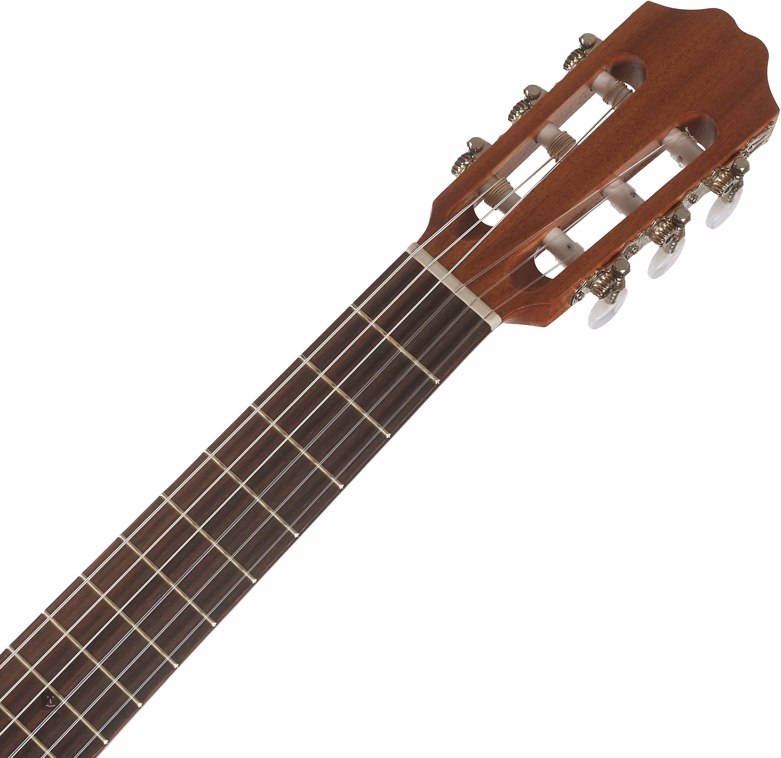 Der Mahagonihals ist mit einem Palisandergriffbrett versehen. Die Saiten sind über den Null- und Sattelsteg aus ABS-Material in Nickel-Stimmmechaniken und einem Palisandersteg befestigt. Die schöne Verarbeitung wird durch eine Umrandung und eine dekorative Holzrosette unterstrichen.