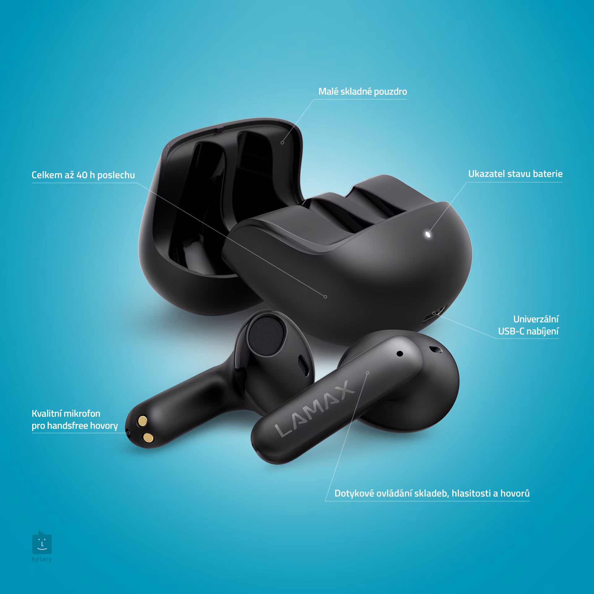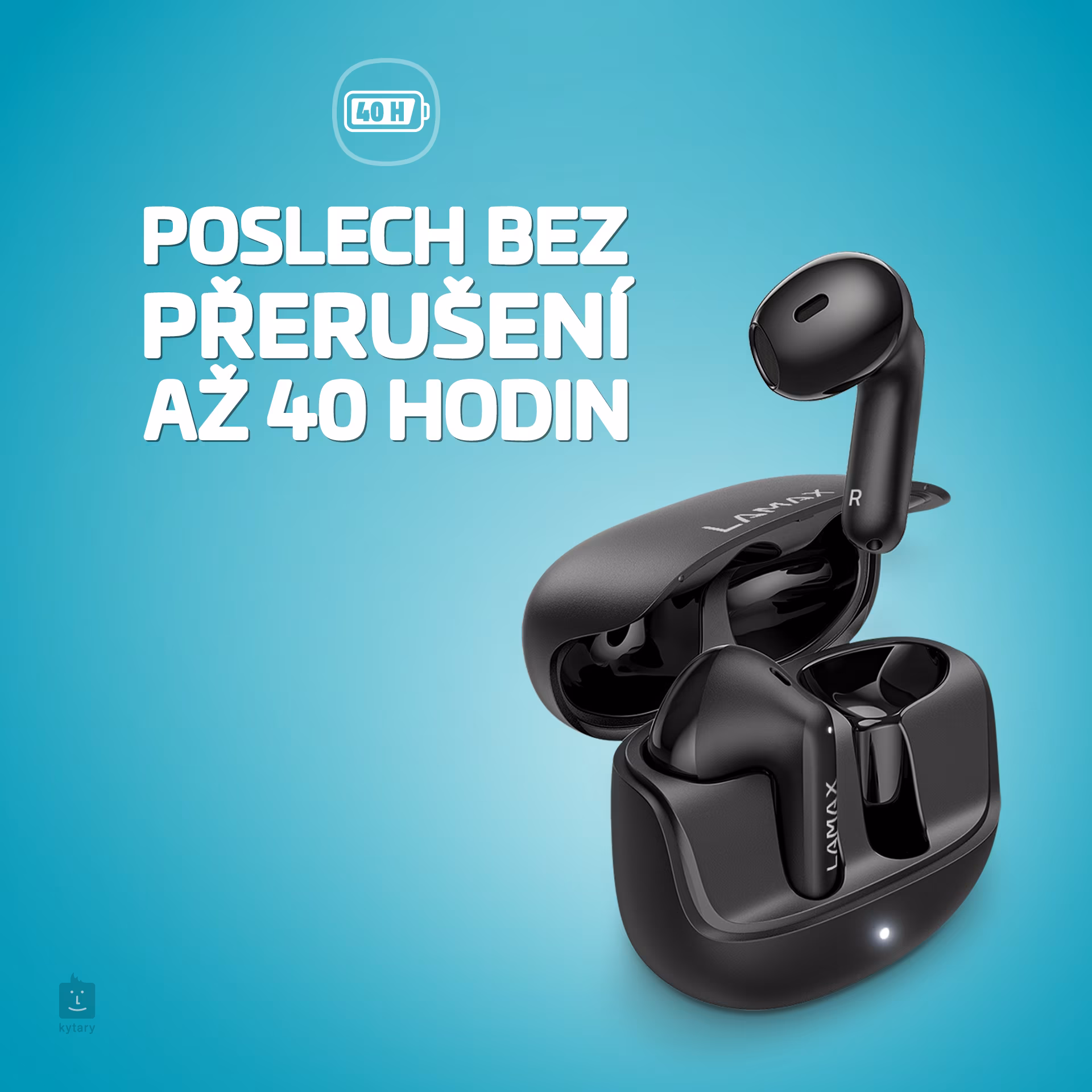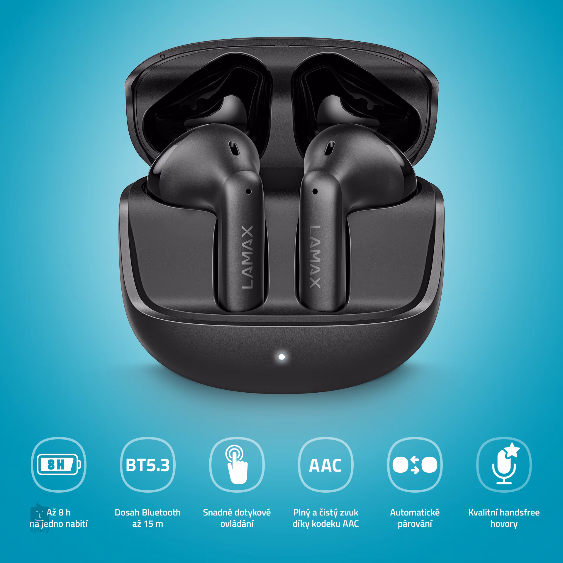 Dank der schnellen Bluetooth 5.3-Verbindung und einer Reichweite von bis zu 15 Metern können Sie sich mit den kabellosen In-Ear-Kopfhörern LAMAX Tones1 frei bewegen und bis zu acht Stunden mit einer einzigen Ladung und bis zu 32 Stunden mit der Ladehülle hören. Genießen Sie jederzeit und überall großartigen Klang.
