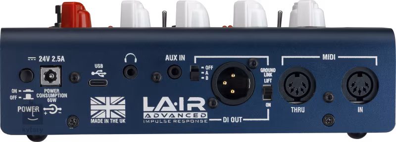 Auf der Rückseite finden Sie einen Kopfhörerausgang für leises Üben zu Hause, einen Aux-Eingang für die Wiedergabe von Backing-Tracks und eine transformatorisolierte Effektschleife für die Integration Ihrer bevorzugten Pedaleffekte. Es gibt auch einen USB-C-Anschluss für die Verbindung mit der LAIR-App, die direkte Verbindung mit Ihrer DAW oder die Aktualisierung der Firmware. Außerdem gibt es einen MIDI-Eingang/Thru für den Anschluss externer Steuergeräte. Für die Stromversorgung ist ein 24V-Adapter im Lieferumfang enthalten.